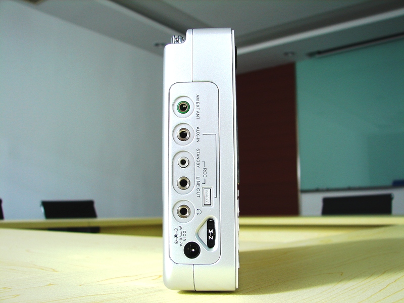 左侧配备了丰富的功能插口,特别的是线路输入端口选择按键也设计在旁边,很小,误操作的可能很小,那个印有M N的黑色物件是外接天线信号强弱调节旋钮,照片没有交代清楚,和老版一样,山进没有为机器配置便携手绳,可能是考虑到机器太大,没有必要携带到户外。