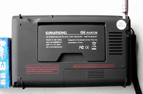 点击打开连接/FONT></A><BR><BR>产品简介:<BR>调幅/调频/飞机频段频率/短波 便携式收音机单边带调制<BR>随身携带贴身“飞行员”,您可以有多重收听选择。调频至AM,FM,飞机波段或是短波频率,包括单边带调制您可以一键进入任何频率。或者您可以使用自动调台的功能来浏览电台或者停止在下一个可用的频率上。您也可以使用D5 调频领略一下正在播出的节目--一次只需5秒钟您就可以在下一个可用的频率上停下来。使用国际时钟和闹钟让您无论在世界各地旅游时能够让您准确安排时间。<BR><BR>技术参数:<BR>AM,FM/飞机频段频率(117-137MHz)和长波/短波(150-29999kHz)<BR>单边带调制<BR>数字频率显示数字调谐<BR>700 个存储(4个页名编辑)<BR>供电途径:2节5号电池(不附带);2节5号可充电镍氢电池(不附带),交流适配器(附带)。体积:125 x 76 x 29 mm <BR><BR><BR><BR>根德G6(飞行员)操作手册<BR>2008-04-05 08:42<BR>摘自广播论坛,作者:纯业余<BR>根德G6(飞行员)操作手册<BR>G6 飞行员(首次发现伊顿公司给国产收音机起绰号,有外号的都是牛机,比如:YB400绰号快艇男孩。)<BR>调频/中波/航空波段/短波带单边带的收音机。<BR>用户操作手册<BR>根德收音机产品系列版权为“伊顿收音机次研发中心”(次研发指,非本人研发,拥有版权的委托他人研发的一方)官方网站:www.etoncrop.com<BR> 您需要帮助吗?<BR> 如果您需要求助,请联系我们,星期一到星期五,上午8:30到下午4:00,北美洲泛太平洋标准时间。美国境内电话:1-800-872-2228,加拿大电话:1-800-673-1648,国际服务电话:650-903-3866;传真650-903-3867;网站:www.etoncorp.com;通讯地址:1015 Corporation Way,Palo Alto,CA 94303,USA<BR>警告:<BR>1,不要将本机器暴露在雨水和潮湿的环境。<BR>2,不要将本机器浸入水中或者暴露在曾经比较潮湿的地方。<BR>3,如遇到潮湿或者雨淋应加以保护。<BR>4,本机只能在0摄氏度到40摄氏度的环境温度中使用。<BR>5,如果机器被液体溅湿,或者异物落入机器,接口不能立刻使用。<BR>6,只能用干抹布擦拭,清洁剂或者化学溶液会损伤机器。<BR>7,严禁在雷雨天气使用外接天线。<BR>8,不可以自行拆解机器。<BR>9,售后服务,只限定于本公司售后服务人员。 <BR>环境保护:废弃处理<BR>依照欧洲2002/96/EC环保规定,所有电器和电子产品垃圾必须分类丢弃在当地垃圾分类采集环保处理系统。请您遵守当地法规,不要将电子垃圾丢弃在普通生活垃圾中。<BR>随机都包含那些附件?<BR>1,用户操作手册。<BR>2,品质保证书。<BR>3,携行袋。<BR>4,携行带,用于固定。<BR>5,外接天线。<BR>6,交流电源适配器,充电功能。<BR>G6使用2节五号电池,如碱性电池、锂电池和镍氢电池或者直流电源适配器。在液晶屏幕的右上角显示字母A表示使用适配器,区别于使用电池。<BR>*开机或使用定时关机。<BR>快速点按(电源/睡眠)键,机器常开。如果按压(电源/睡眠)键超过3秒,则是带睡眠关机的开机。<BR>*数字键盘1到8有双重功能。<BR>数字键盘1到7具有双重功能,一个功能是用做关机,另外用做开机,详细功能我们将详细介绍。<BR>*使用镍氢充电电池。<BR>可选用交流电源适配器充电,在机器内置2节镍氢可充电电池(随机不附带)。充电的时候机器仍能正常使用,定时充电功能将开启。<BR>给电池充电:<BR>1,将机器关机,装入两节5号镍氢充电电池,然后连接交流电源适配器。<BR>2,点击电源充电按键(7号数字键)保持3秒钟,直到在屏幕的右上角显示“CHG”。<BR>3,旋转飞梭选择充电时间(00到36小时),基于电池的毫安量选择时间:11小时适用于1100毫安电池;23小时适合2300毫安电池;依次类推。<BR>4,结束充电后,点击(PAGE/TIME)键。电池充电时,显示屏的电池标记电量不断的从左到右闪动。如果标记充满,则停止闪动电池标记满格,表示电池已经充满。<BR>*当您不在北美的时候如何设置调幅或者调频。<BR>您的机器出厂默认使用地区为北美(美国或者加拿大),如果在北美则不必设置。如果您在世界其他地区,您或许需要修改步进。<BR>*设置非北美地区的调幅和调频步进。<BR>在北美,调频起始于87.5兆赫,其他地区,也许起始于87兆赫或者76兆赫。<BR>1,机器关机状态下,按压“4号数字键”保持2秒钟。F87.5,F76或者F87在屏幕中闪动。<BR>2,按压“4号数字键”选择需要的选项。<BR>3,然后快按“PAGE/TIME”键。<BR>在北美,中波步进是10千赫兹。在欧洲或者其他地方,是9千赫兹。<BR>1,机器关机状态下按压“5号数字键”保持2秒种。9或者10千赫兹闪动显示。<BR>2,点击,“5号数字键”选择需要的选项。<BR>3,然后快按“PAGE/TIME”键。<BR>*使用睡眠关机功能。<BR>睡眠关机功能能让机器在指定的(00到99分钟)关机。<BR>1,启动睡眠关机,按压“PAGE/TIME”键2秒种,01到99在屏幕中显示。<BR>2,旋转飞梭选择分钟,如果你不想使用睡眠功能,也可以用飞梭选择显示“ON”。<BR>*音量控制<BR>在机器开关机状态下,均可使用“+ -”音量键调整音量,总共分为“0到31”级,调整时屏幕会显示音量数字。<BR>*耳机插孔和使用耳机(随即不附带耳机)。<BR>在插耳机前先将音量关小,插上耳机后在调节到您需要的音量。耳机插孔在收音机的左侧。<BR>*选择调频,中波,短波和航空波段。<BR>当收听调频,短波或者航空波段,使用拉杆天线。当收听中波的时候不需要拉开天线(中波磁棒内置于G6)。<BR>开机,如果选择调频,按压“FM BAND”键。如果选择其他波段按压“MW(AM)/LW/AIR”键循环选择。在短波状态下,按压“METERBAND”键循