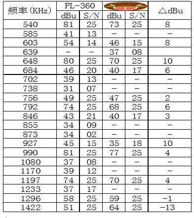 1 PL-360与某对比机型都采用机内天线时的场强与信纳值: