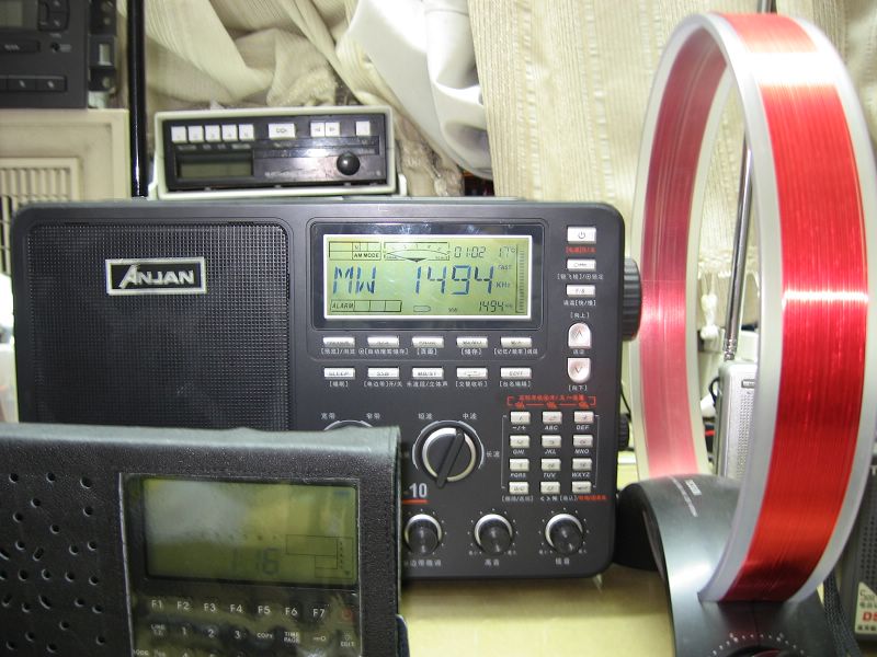 高端:1494KHz操的是英语,正在播爵士乐;1503KHz操东南亚一带的语言,听不懂;1530是浙江电台城市之声在杭州播音,陆上距离687.8公里,天上直线距离470.6公里;以上3台情况类似,与之前不同,1103收听良好,声音清晰可闻,背景噪音也大,DTS-10在信号强时可以收听,噪音比1103小,但信号衰落时就不行了,在不大的噪音中一点语音都找不到了,情急之下,将德生的环AM200套了上去,旋动旋钮,信号达到1-2格,终于有声音了。