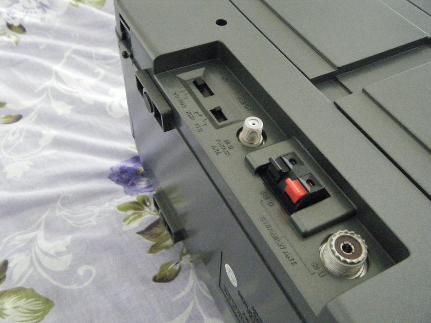 内置了141.4cm长的铝合金拉杆天线,身材极其的粗壮,但选材普通,质量和手感感觉都很一般,收回后在顶部凸起近1cm,虽然方便了使用,但一定程度地影响了美感,也不利于搬运安全。采用的中波磁棒仅仅只有10cm长,其实理论衡量磁棒标准的是长度直径比,这个细细的10cm棒子规格并不低,可惜的是它的表现的确一般,据称SAT800的中波灵敏度曾经最高实测到0.1mV/m,正常的也很少有差于0.15mV/m,但实际表现总是有点差强人意。SAT800前级与拉杆天线的匹配不是太好(尤其是短波),使用拉杆天线并不能完全发挥机器的性能潜质,在众多使用自身拉杆天线的PK中,有接收机底子的SAT800每每在SAT700、SW77、2001D和E1XM面前显得有些尴尬。在动态控制上则完全继承了SW8,达到了中档接收机的水平,抑制过载能力非常的强悍,接上外置长天线,它的表现则完全让人刮目相看,可惜我一直没有能架设出优异的室外天线,平时多是随随便便架设。我在进行SAT800与2001D使用本身拉杆天线的AM对比中,很显然2001D在SW DX中表现的略胜半筹,在搜索完整个SW波段后,明显在多个频率上接收到了微弱几不可闻的信号;但在收听中,SAT800则明显要稳定的多,这得益于机器相比他机器更为优秀的增益设置,排除个体差异,这与多数玩家的结论完全一致。奇怪的是,说明书中表述了SYNC不仅仅在应对临频干扰,而且在改善增益上也有所裨益,但在实际使用中却体会不到优势,也许想找到只被污染了某一单边的频率实在需要运气,我平时更多的是在关注机器本身,广播听的并不多,在不多的时间里一直没有遇到这样的好运气。SAT800使用了6.0、4.0和2.3kHz三只带通滤波器,实现了真正的SSB(USB/LSB)设计,BANDWIDTH+SSB在对付临频干扰和失真上效果来的比SYNC更直接。SW8的FM波段好像完全就是应景的设置,增加它仅仅只是为了实现全波段接收,SAT800在改型中也继承了这一思想,FM灵敏度表现的相对一般,完全不能符合高端收音机的身份,好在综合指标非常均衡,所以总体表现虽然不出彩但倒也中规中矩。在机器背后针对各波段设置了各种规格天线接口,极大地方便了室外天线的接入。