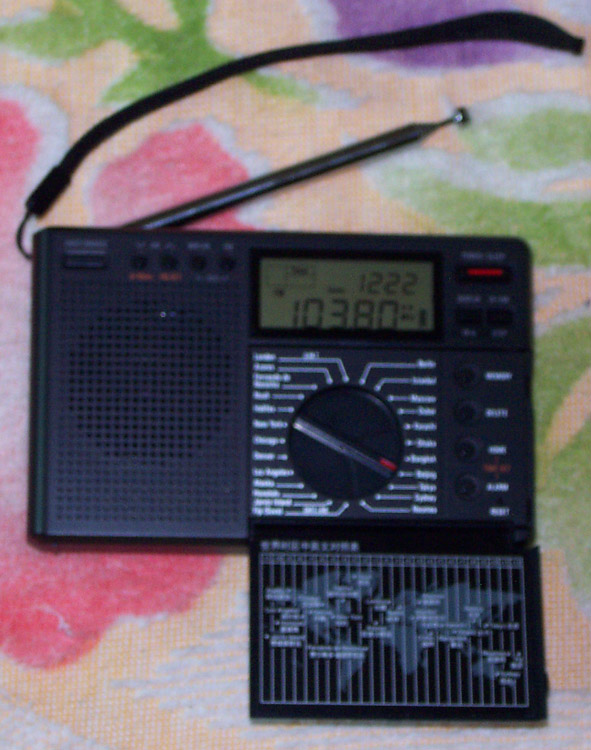还来不及看说明书,我便急不可待给PL-300WT装上三节5号充电电池,开机试听。由于PL-300WT没有直接输入频率的数字键,只能通过PL-300WT的飞梭进行调谐电台。按下中波段的按纽,扭动飞梭,想调出1170KHZ本地强电台“中国之声”,由于是第一次开机,选择中波后机器的中波频率显示522KHZ,心想从522KHZ到1170KHZ的频率,有不少的频率距离,要扭动飞梭好多圈才能到1170KHZ,所以我便快速转动PL-300WT的飞梭,眼睛直瞪着PL-300WT屏幕,这时候突然发现当我快速转动飞梭的时候,频率的变化是以每步100KHZ的速度变化,没转几圈频率就到了1200KHZ,这时候我停止转动飞梭,再慢慢往回转飞梭,频率显示1197KHZ、1188KHZ、1179KHZ、1170KHZ。原来PL-300WT的飞梭有智能速度自动调整功能,转动飞梭快,中波频率以100KHZ为一步进变化,转动慢和时候,中波频率以正常的9KHZ为一步进。本地强中波台1170KHZ调谐到后,机器的喇叭马上出来广播电台的广播声音。
