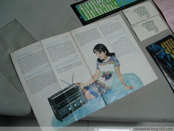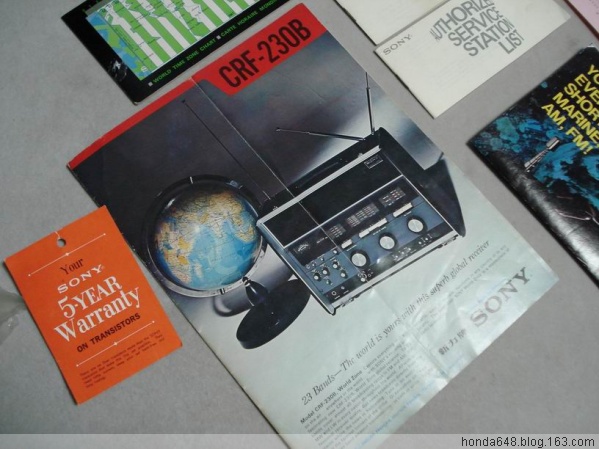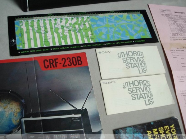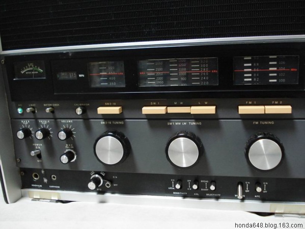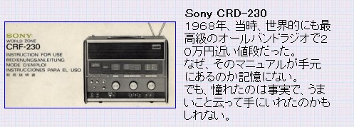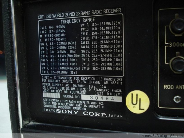 SONY CRF-230 产于1970,23个波段。当时SONY做广告语就是THE KING OF THE RADIO(收音机之王的意思)是全球第一款短波收音机二次变频带SSB,到现在为止在模拟机中世界排名第二,重达15公斤,30斤。此机在国内有但非常稀少,而且国内的机器不是这个不好就是那个面板没有,基本没有这么全套的。此机一般都是省级电台使用,国外也是可遇不可求,很少能买到。我从来没见过模拟机有这么高的精度和收台的密集性,0.1kHz的步进连7600GR都达不到况且这是模拟机啊,密集性更难想象,我不知道具体参数我只知道在中波上每调过去1毫米就有一个清晰的电台,在FM中一点没有串台现象,我在市中心电波干涉很严重,但是在这个机器下面分的一清二楚,今天早晨我调到88Mhz稍微上一点的位置听歌,为了看看它到底是什么频率我用2001D测试,我调到88.6一听不是那个台,然后再往回调直到88.0MHz一直没收到这个电台,难道2001D收不到?我就很缓慢地拨动2001D的飞梭终于在88.35MHz上找到了这个台2001D里伴随着不清楚的沙沙声(230很清楚),要是你不知道那里有个台,光凭你平时的调节习惯发现不了这个台,而我用230很轻易的捕捉到了。她的频段显示表国外叫Film tuning就是胶卷式的意思,指针不动而是频段显示表上下移动,看上去是一个移动平面(就像一张纸),你看不到里面有圆弧的样子(实际里面是个卷筒结构),3个大调节按钮很重很滑爽径向无任何间隙,你调的时候稍微带有一点点旋转惯性(因为重全是铜制材质),当调到一台要它停下的时候要稍微要给一点点刹车,感觉很有意思。声音就像家里的音响,有2个均衡器可以调节,你要什么效果有什么效果,就写这么多吧。
