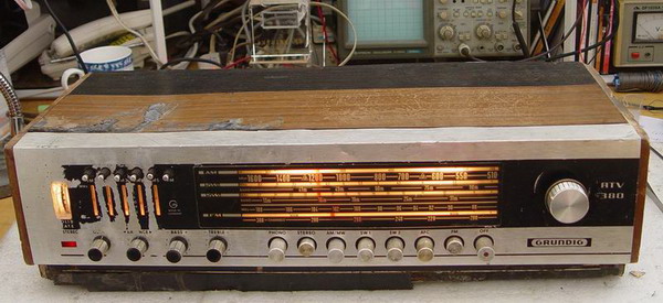 这几天本村旧电器收买佬送来“根德 GRUNDIG RTV-380”收音机来换我米(3位数)。来时真如垃圾一般。这图片已经是经初步打理后的模样。还伤痕累累。待下一步复原。搜索广坛就查到京城著名JS“将军罐”出过台,被ZDJ网友收下。但那台是LM/AM/SW+FM的,我这款是AM/SW1/SW2+FM实用些吧。2路10W/5欧姆输出,带立体声解码器,FM有5个预选按健。
