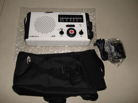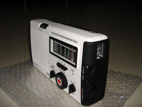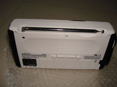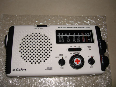 今天刚收到Eton FR350收音机,第一感觉还不错。做工精致,造型也比较符合俺的口味。当初买这款收音机的目的,是防灾时使用。因为其提供了四种供电方式:手摇、AA电池、内置充电电池、交流电。带有照明和报警功能,以及为手机充电功能。并且具有FM88-108Mhz, AM530-1710khz和8个波段的SW 5.95-21.85Mhz,是美国红十字会的指定产品。今天试用了一下,接收和音质还不错。只是接收FM时,同一电台在房间的不同地点会出现音量不同的现象,好象是信号强度不同的缘故。另外,说明上说主调谐旋钮上集成了精确调谐旋钮,但收到的实物,好象只看一个主调谐旋钮,不知是不是精确调谐旋钮是隐藏的呀?这款收音机是美国朋友从美国带回来的,但机器上标识的是Designed and Developed by Eton Palo Alto, Assembled in China,看来是研发和设计是在国外,中国组装。详细的功能和性能还没有试,先上几张图片看看。