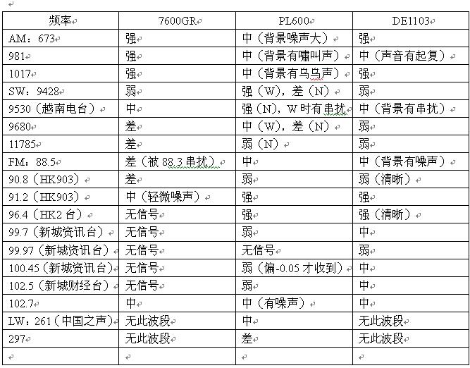 很多朋友都很关心机子的接收灵敏度和性能,俺也一样,一拿到机子就立即进行了测试和对比,PL600是德生第一款数调二次变频收音机,这也使德生的便携机由第三世界迈向了第二世界,理论上已经与SONY 7600GR、DE1103平起平坐啦,但实际的接收效果如何呢?为公平起见,三台机子都在同一地点进行对比测试,得出以下结果: