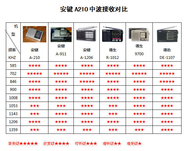不出我的意料和判断,A-211不弱于A-911、9700、1012处于同一个数量级,效果相近,略弱于二次变频机A-1206,A-1206由于体积太小,又弱于王者1107。DX功能对收听附近地区的FM帮助明显,是本机的一个亮点。有人体感应,抗干扰能力较弱。镜像干扰存在,DX时严重。
