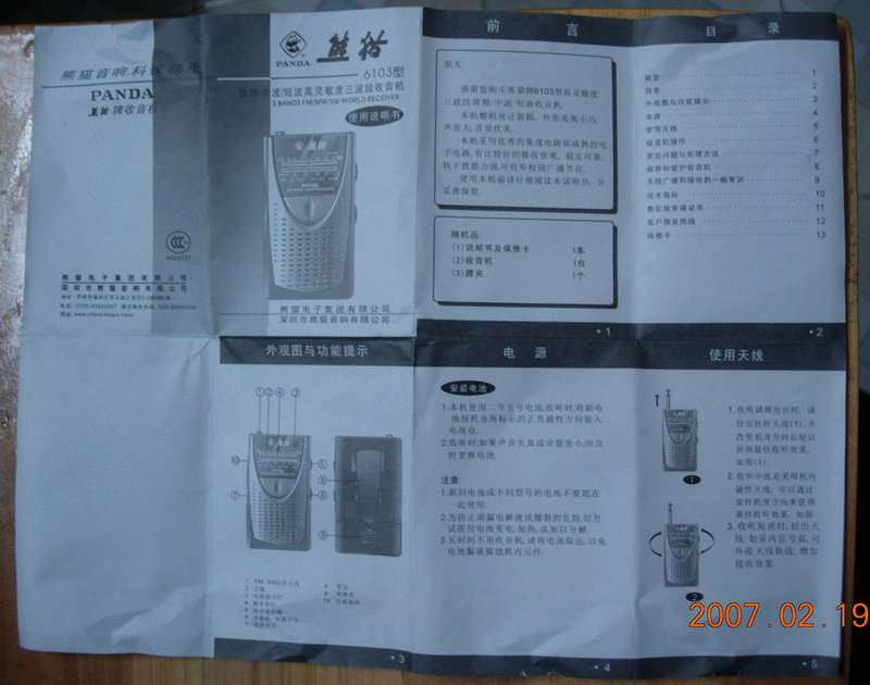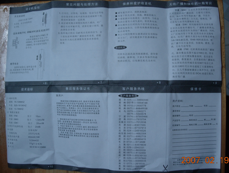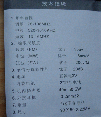 本欲让店主拿出两个来对比挑选,店主一阵翻找,仅有样机一台。只好试机,妥当方拿下。由于在电子市场的环境,电磁环境差,小小收音机自然表现不佳,只在FM收到3个电台,放的全是音乐。其他试不出电台,只收到无台状态的“沙沙”声。与店主说好一周内有问题再更换,于是开钱走人(20元)。装盒时发现竟然也有一份说明书,也不错哟。