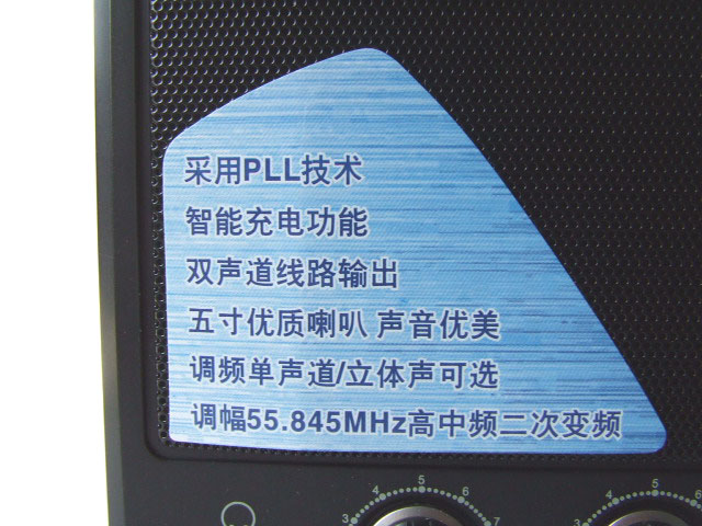 个人感觉主机外观不漂亮的说,虽然乐信的老板好象是位女士,但确实对外观的漂亮度关注不足,其实如果去掉喇叭左下角的纸贴和改进主机右下角“50个电台存储”这几字的颜色,将会很靓丽。