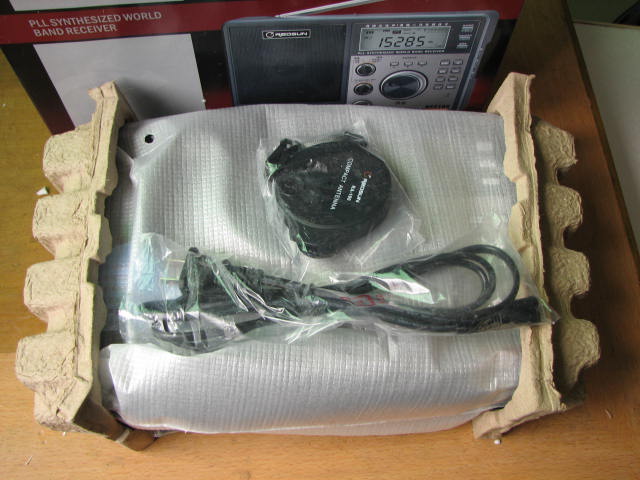 邮局的女工作员递过来一个胶合板做的有点大的箱子,做工不马虎,挡头还打磨过。心想里面的衬垫可能有点厚,要不箱子怎这么大?回到家打开一看,呵呵,怪不得是大箱子,里面的机子虽粗看和德生的BCL2000挂像,其实个头要大一圈。机箱中的泡沫衬垫六面都有,每面一厘米厚。这使我想起德生的包装风格,当初一个包装就令我激动不已至今难已忘怀。乐信的包装同样令我感叹,心想,有这样的认真态度,何愁做不好收音机?