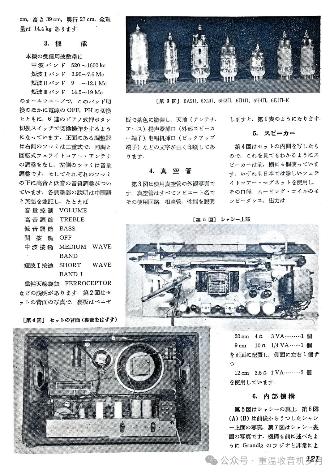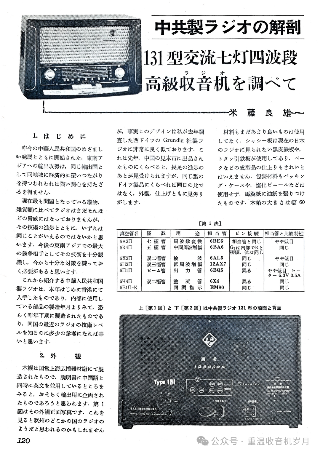 日本“无线电实验” 杂志一九五九年六月号上,刊载了松下电器第一工场朱藤良雄写的一篇题为 “中共制收音机的分析 ——131 型交流七灯四波段高级收音机的研究” 的文章。文章一开头就表现了作者对我国无线电工业飞跃发展的那种惶恐心情,口口声声说这将是对日本无线电工业的 “威胁”。文章的结尾,更是吃惊不已地说:新中国 “能够在很短的时间,出口了这样的收音机,雄心是多么大啊!”
