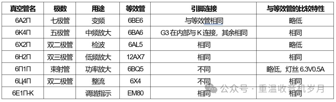 图3是所使用电子管的外观照片。所有电子管均为苏联型号,其使用电路、等效管及性能说明如表1所示。 表1