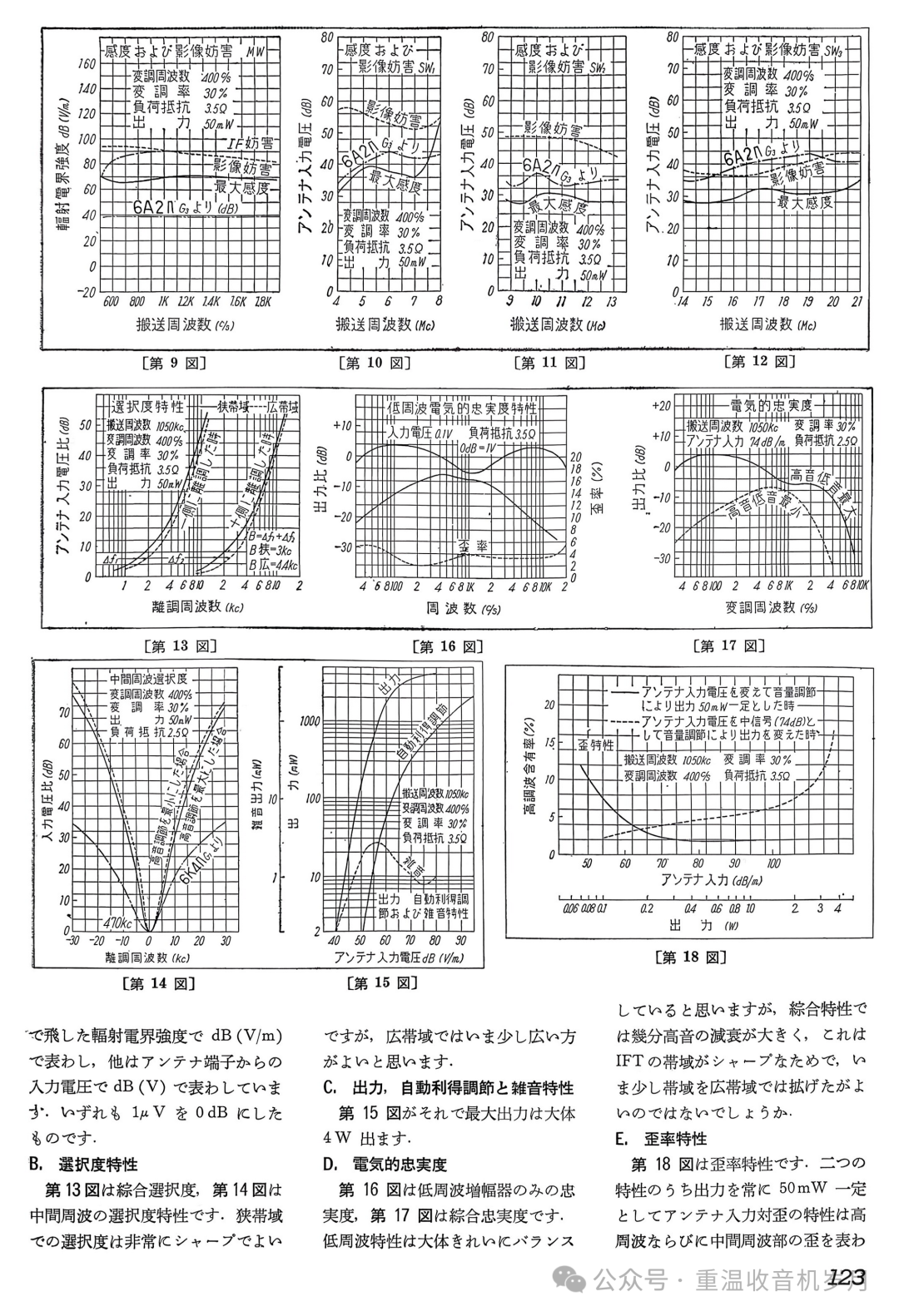 图9、10、11、12是各波段的灵敏度特性。图9中波的特性以环形天线辐射的电场强度dB(V/m)表示,其余则以天线端子的输入电压dB(V)表示。所有数据均以1μV为0dB基准。