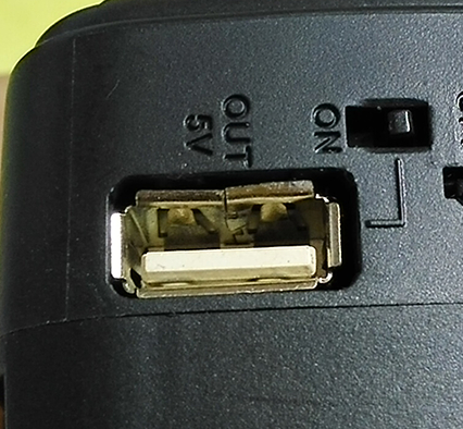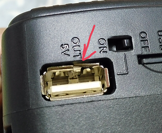充电输出USB口有点没安装好(见图中箭头处),有一边的铁片没伸出来卡在机壳内侧,我把它弄出来了。