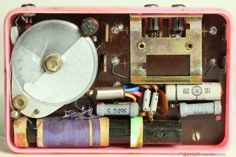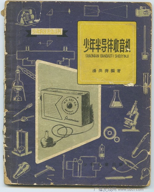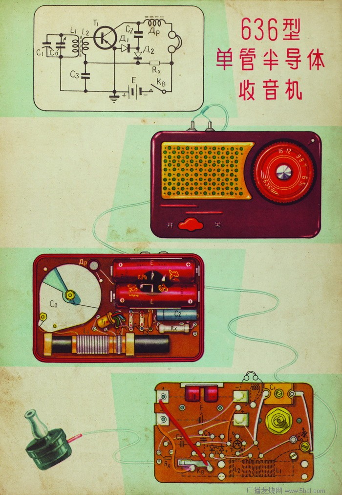 三、 636的成功,还与它的外观设计有着极大的关系。造型小巧时尚、色泽艳丽高雅之外,636的设计者很好的抓住了国人“讲面子好虚荣”的心理,做出了一台很象收音机的收音机。单管机一般使用耳机收听,没有喇叭,636就是如此。但聪明的设计者却给636按上一块闪闪发光的金属喇叭窗(后来又有塑料喇叭窗的款式),使电路和结构非常简单的636看上去就是一台装备齐全的收音机。再看早年的其他单管机,甚至两管、三管机,只要没喇叭的,基本上都没有喇叭窗,给人的印象更象是大小不同的肥皂盒,看起来根本不象收音机。在那个物质相对匮乏的年代,收音机乃是富有高贵的象征,谁愿意花钱买个肥皂盒拿出去显摆呢?我们仔细观察一下就会发现,636半边弧形喇叭窗配以圆度盘,是60年代中前期很受人们衷爱的造型。当时出版的几种晶体管收音机制作的图书,都出现过类似的款式。例如当年风靡一时的《少年半导体收音机》一书的封面上的收音机,造型就与636近似。