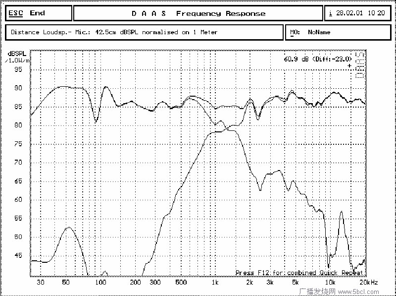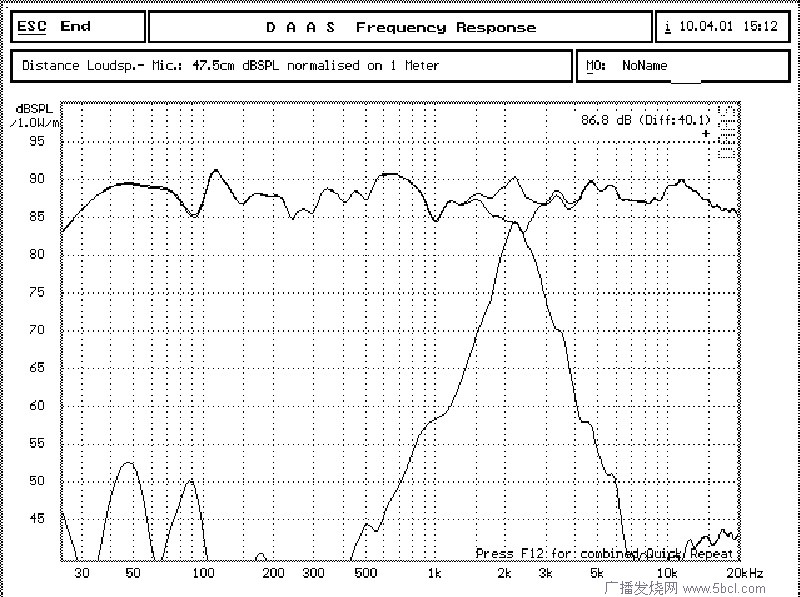 这时我们把中低频部分做适当的增减,同时联动调整了分频点到2.3K,至此听感、参数基本达到了设计要求。灵敏度在87.5dB±3dB范围内。(注:此时的两款高音单元在测试曲线上差异很小,故只给一个曲线)