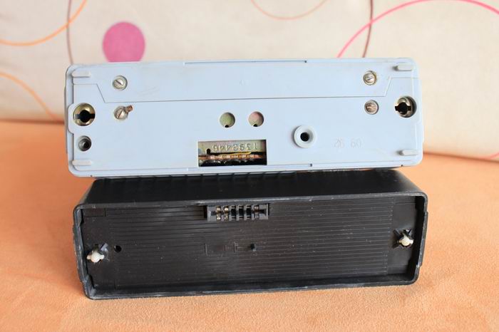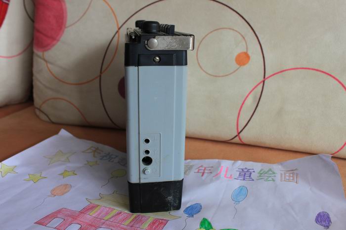 该机后面黑色的是电池盒,可以拆卸下来,里面可以安装6节2号电池,由于电压较高,因而功率比较强大,动态范围较大,这是该机的一大优点。