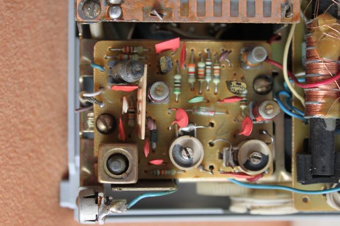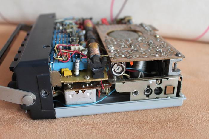该机结构很紧凑,不像国产收音机就是一片电路板、右边一只喇叭、下面安装电池、上面是天线的简单结构,作为支架的金属板表面处理很好,至今没有生锈。