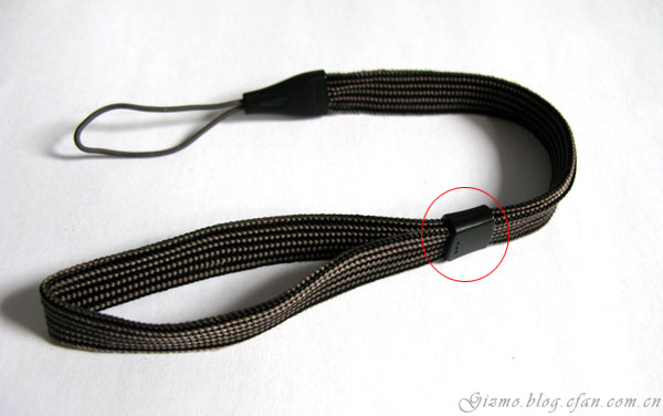 图中有一个可以在挽绳上滑动的卡子,可以把挽带挽在手上后收紧挽带至手腕处,很好很实用的设计。