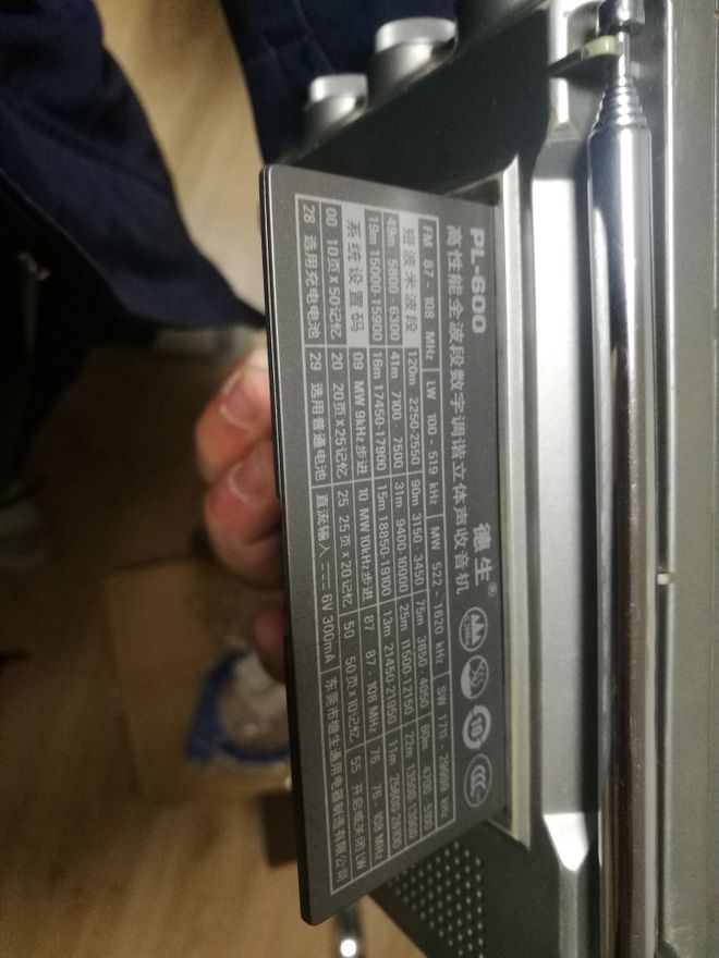 背部折叠支架上面印着支持波段和系统设置码。这个收音机支持AM LW 100kHz,参数比PL365的150-29999稍微要宽一点点。而1620-1711这个波段没记错的话也可以通过美标的切换实现接收,所以整体来说是可以配得上全波段这个称号的。