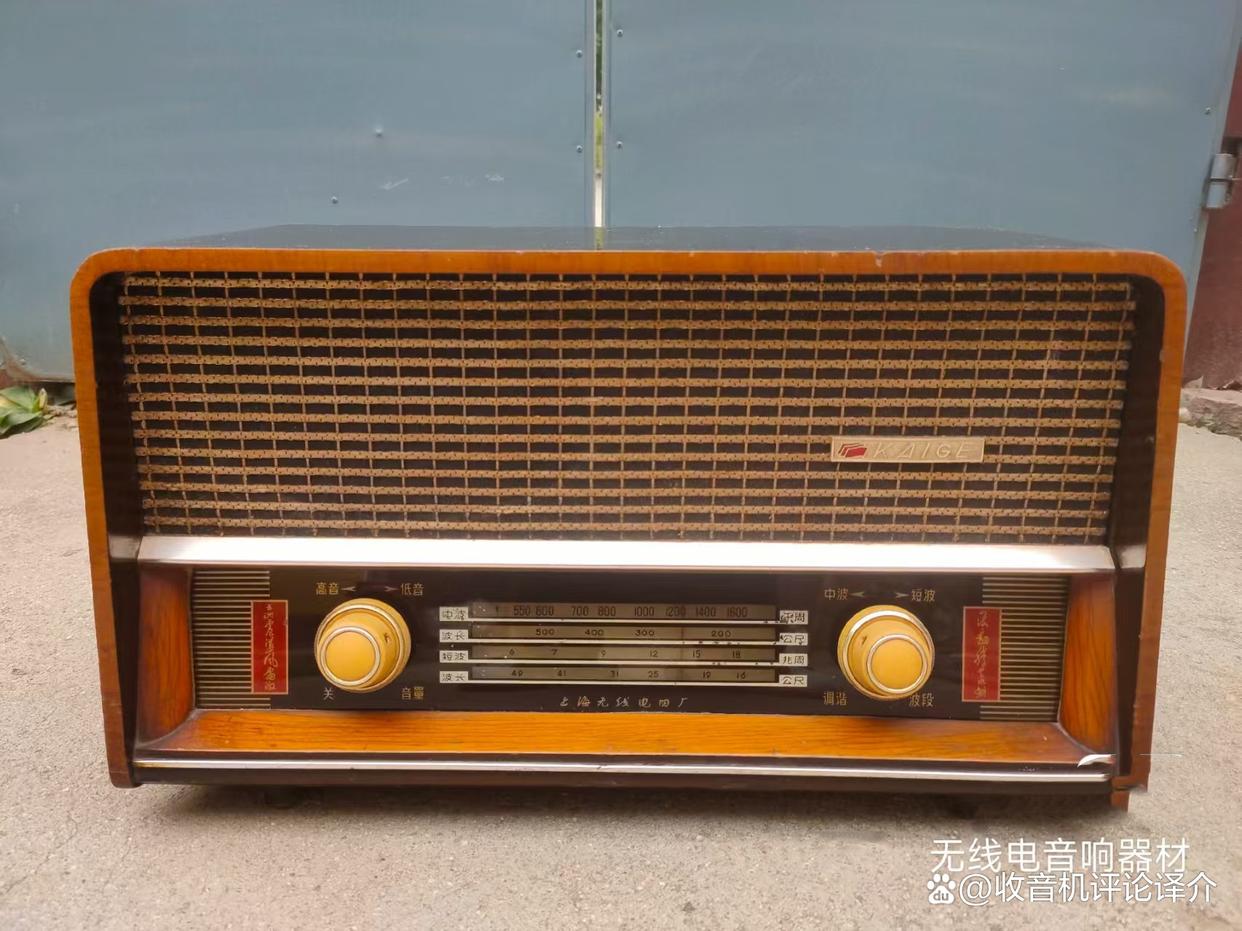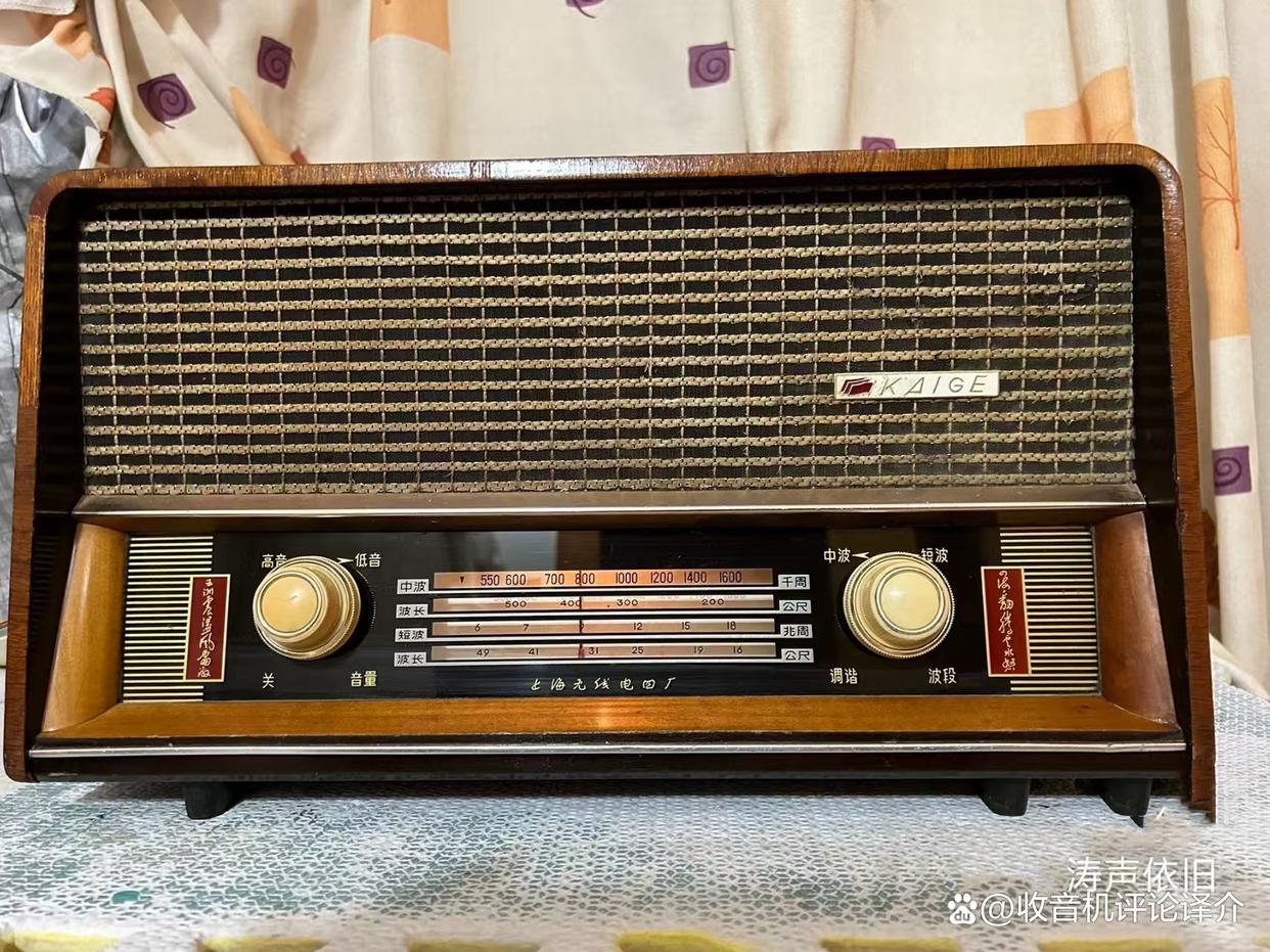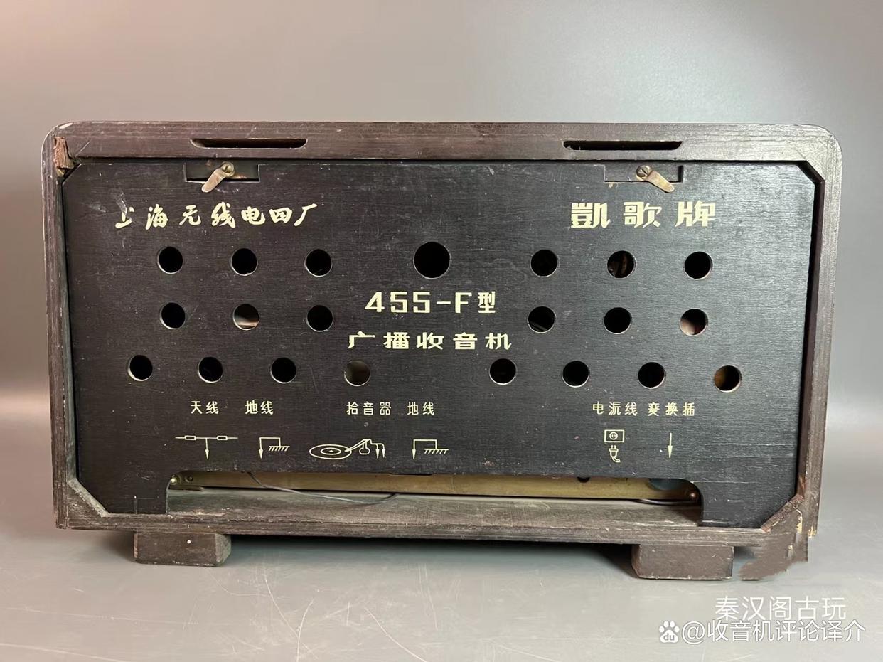最近在论坛上向网友购入这机,成色较好,达八成新,外形也很「庄重」!购入价连运费及交通货约为150元。这部凯歌455F型五灯两波段收音机是上海无线电四厂的产品,此机的最大特点是在刻度盘的左右方有一对对联,凯歌的牌子用拼音字写出,旁边还有三面红旗,相信是在三十多年前、六十年代时期的产品了。