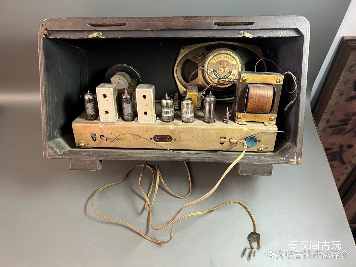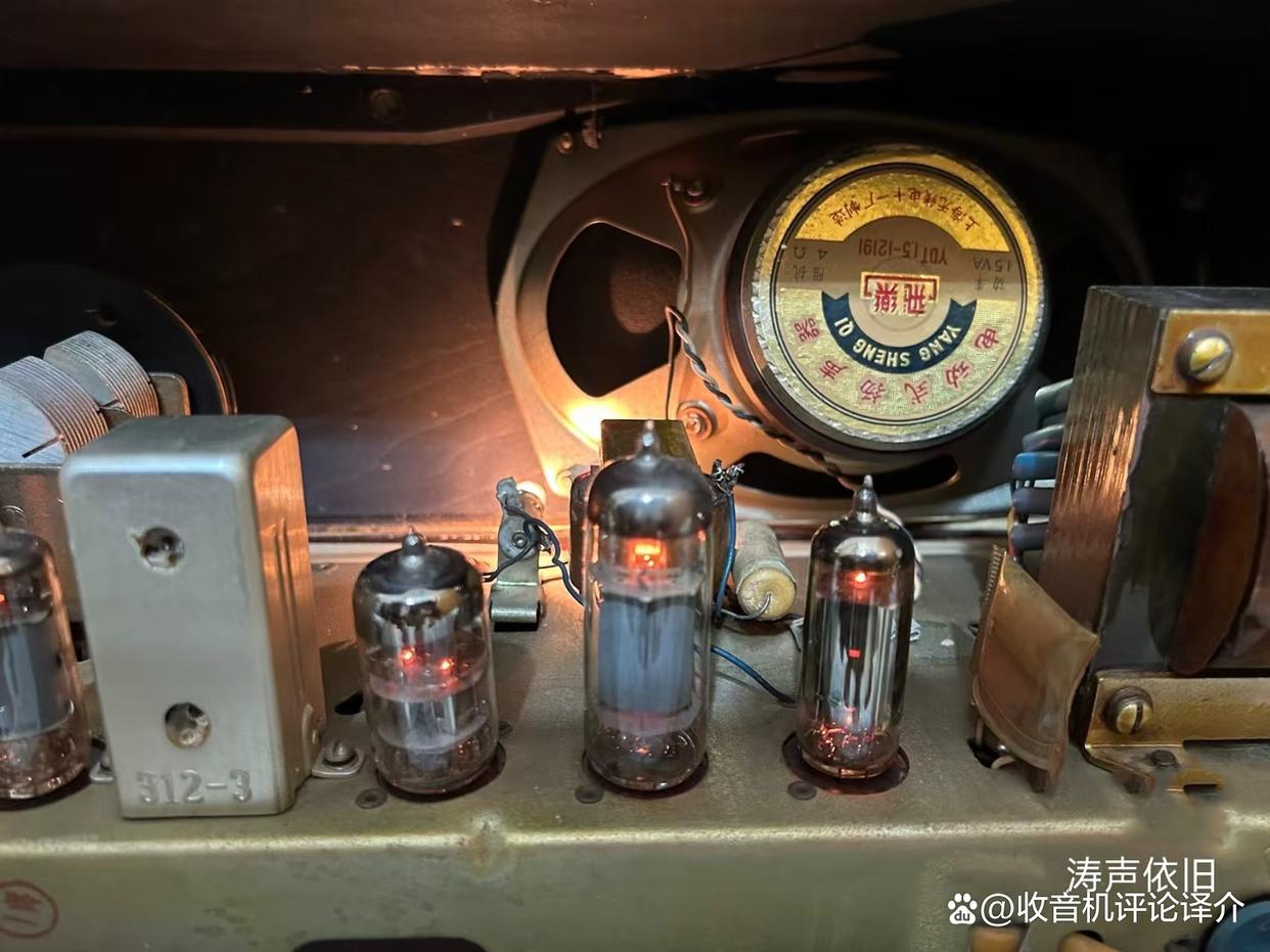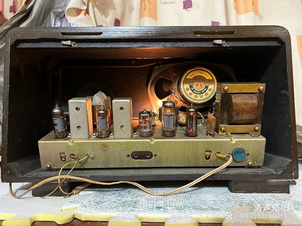 4.此机的灵敏度很高,应归功于机内的电子管不但没有衰老,而且在外型上观看,仍然是相当簇新的,印在管子身上的编号和上海牌字等字样清晰可见;