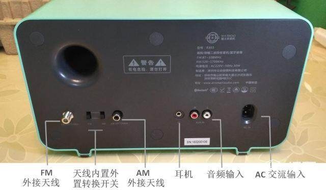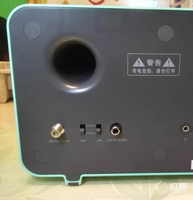 ▼猫王3背部最醒目的一个大大的圆孔一看就是音箱,另后面板有天线、音频输入输出接口,另有AC电警告标签及主要参数及公司的相关信息。