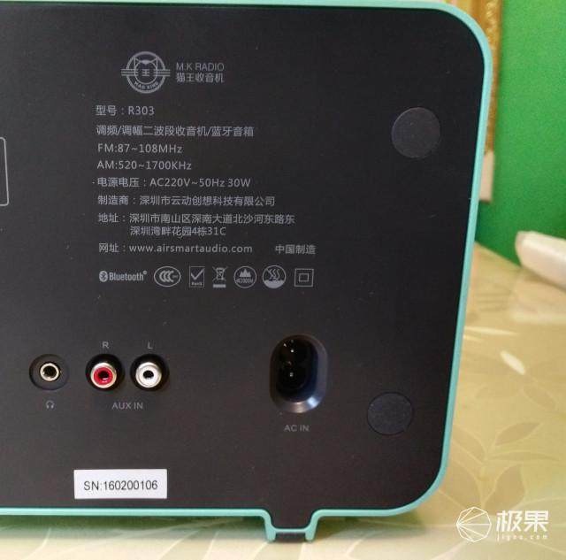 ▼猫王3后面板右边印有猫王的图标及型号、FM/AM频率范围,及公司的相关信息,下面有耳机输出,通用的RCA插座进行AUX输入,让猫王3的音频部份有更多的扩展性。