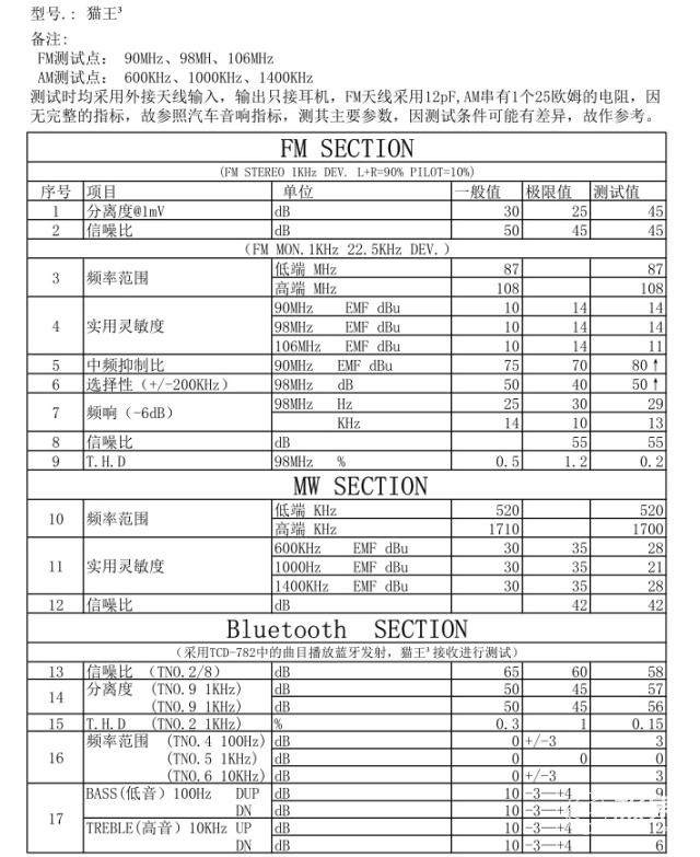 猫王3采用了 SI4831 收音IC,TDA7360 功放IC,保证了其收音的性能良好,本想进行拆机对指标进行精密测试,但这古董真的不想去破坏,最后采用附带的天线进行输入,FM天线接了12PF的电容进行匹配,AM接了25欧姆的电阻进行匹配,用耳机输出测试其音频;蓝牙指标测试将SCD-782专业测试CD碟片上的音频文件转化成wav格式用手机蓝牙进行发射,用猫王3蓝牙接收进行指标测试;通过测试数据可看出FM、MW、蓝牙的立体分离度大、频响宽、失真小,实用灵敏度较好,实际进行FM进行收听电台,非常清晰,低音效果非常理想,另低音、高音调节从低到高有16dB幅度可调节,实际收听时可根据个人的喜爱进行调 节,完全可以与我们的汽车音响进行比美了。