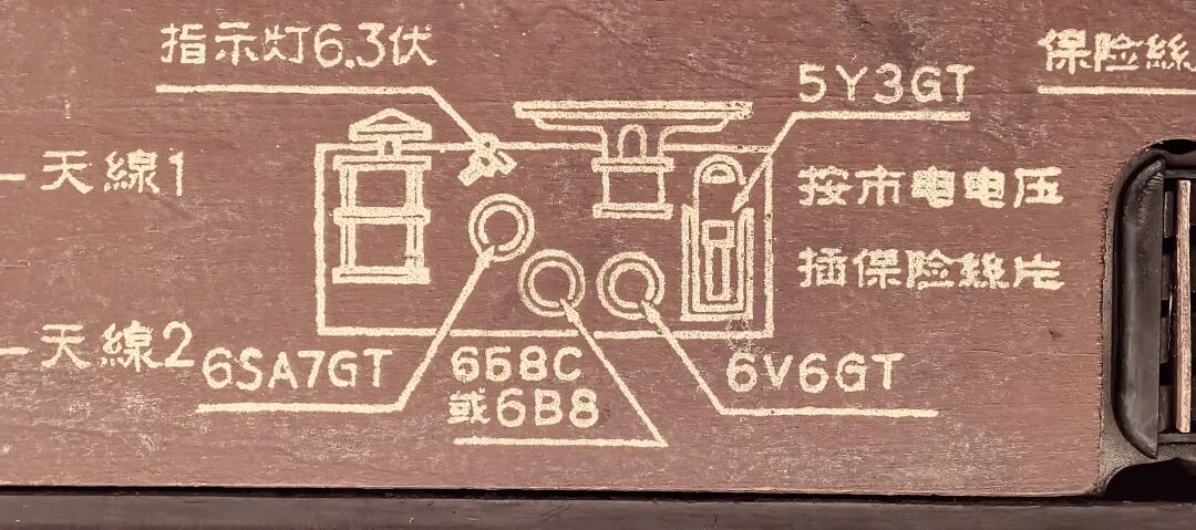 “小北京”电路结构为四灯超外差式,采用来复式电路,兼顾中波与短波接收。电子管配置分别为:变频:6SA7GT;中放/检波:658C(或6B8复合管);功率放大:6V6GT;整流:5Y3GT。接收频率范围为:中波(约530–1600 kHz);短波(约40–120m,对应约2.5–7.5 MHz)。供电方式为:交流市电供电,内置电源变压器与整流管。