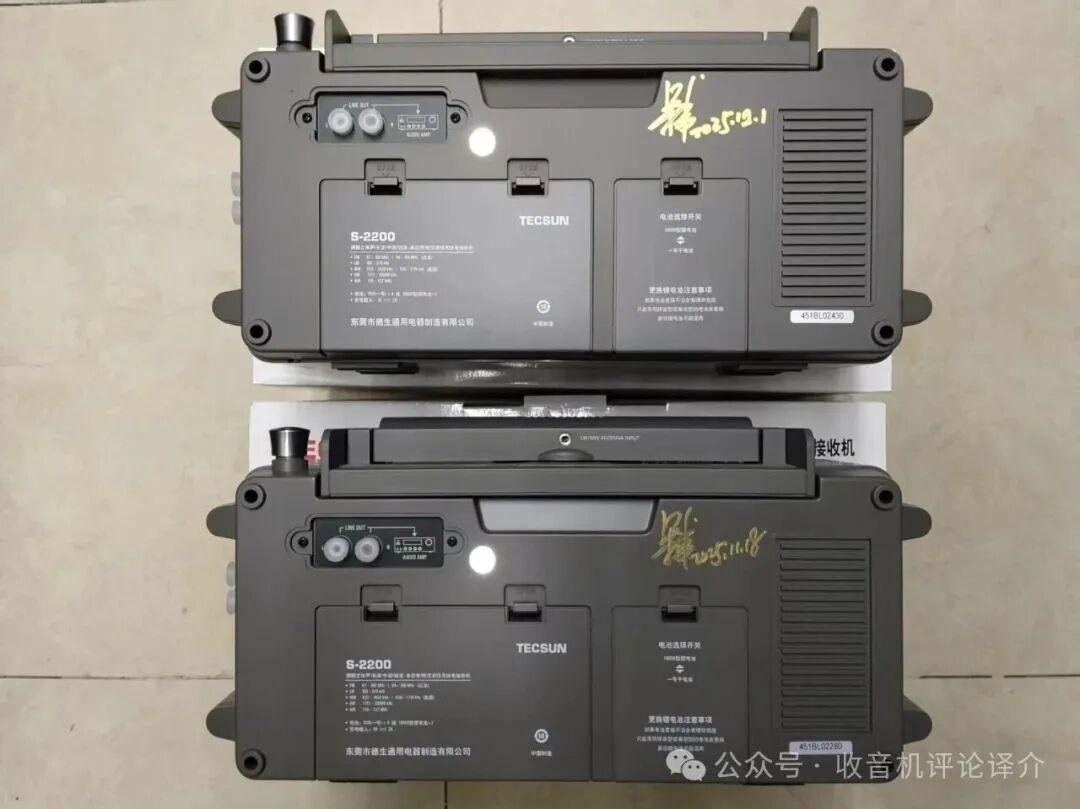 根据最新消息,德生已计划推出升级版S2200,预计在2025年底前后上市。升级版在电路设计(基于PL880优化)、供电方式(新增18650锂电池和Type-C接口)及存储模式(引入ETM+功能)等方面进行了改进,但外观与S2000基本保持一致。(德生-S2200. 厂内部购买1700元,有梁伟老板的签名)