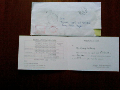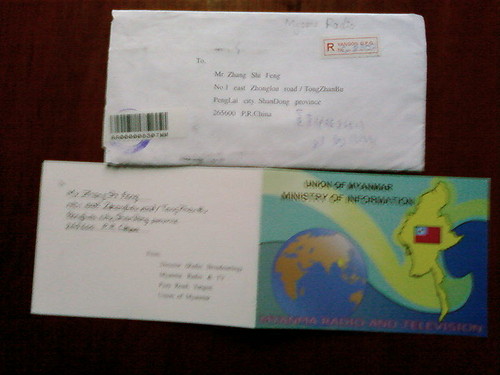 ▲Myanma Radio & TV的折叠QSL卡/背图:彩色的地球、缅甸地图和国旗/二○○六年十月五日/5985khz/签发官:Ko Ko Htway[内附节目时间频率表;二○○七年一月十八日仰光挂号寄出]。