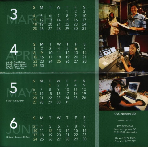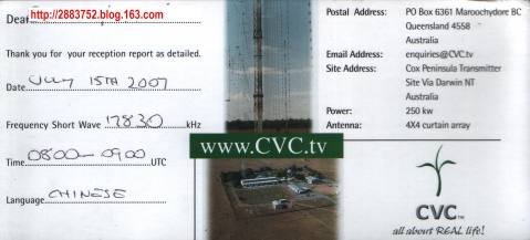 2007.8.14日收到了CVC电台从澳大利亚寄来的信,包括07年历、QSL收听纪念卡(7月15日电邮的收听报告)等。