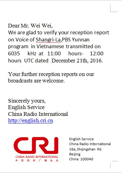 QSL 收到云南人民广播电台香格里拉之声的eQSL卡 广播发烧网 2016-12-23 00:00 · 2295 0 终于收到云南人民广播电台香格里拉之声的eQSL卡了,是CRI代为签发的,封面和CRI的QSL卡一样,是少数民族的,然后他们确认了我在昨天的收听报告 点赞 0 文章目录 × 推荐阅读成功获取国内中波电台QSL收听证明的方法初探获得中央人民广播电台QSL卡的秘籍国际广播电台地址名录(1)我们在倾听:收听澳洲CVC中文电台国际广播电台地址名录(2)国际广播电台地址名录(6)WWVH的QSL过程QSL集装箱[二○○六年一月]我是如何搞定印尼之声华语台QSL收听证明卡的dxman羊年第二波:2月至6月间的26枚QSL 上一篇 川渝广播爱好者2016年度迎新年聚会 下一篇 出色的德生Q3收录机