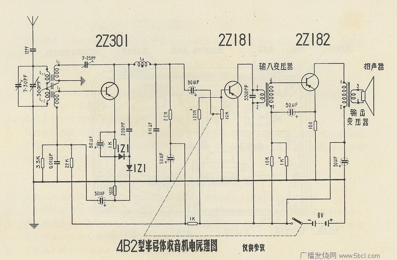宝石4B2的电路设计,非常贴近中国当时的国情,为广大农村及无交流电地区着想,力求提高效率、降低使用成本。从电路图看,4B2应该是60年代比较奢华的来复再生式电路:分段绕制的磁性天线线圈,可改善方向性;频率覆盖采用负温度系数的拉线微调电容,使收音机在环境温度变化时能稳定工作;双回路高频扼流圈,可改善全波段灵敏度不均匀的状况;高频放大级和功率放大级均采用稳定性较高的电流反馈式偏置电路,减少晶体管受温度影响而引起工作点的漂移;采用П型滤波电路,即使电池电压降低到不足一半的2.5V 时,仍可以稳定收听本地电台的广播。最后一点尤其重要,因为60年代人们的生活水平普遍不高,更换4节2号电池的费用负担不轻。