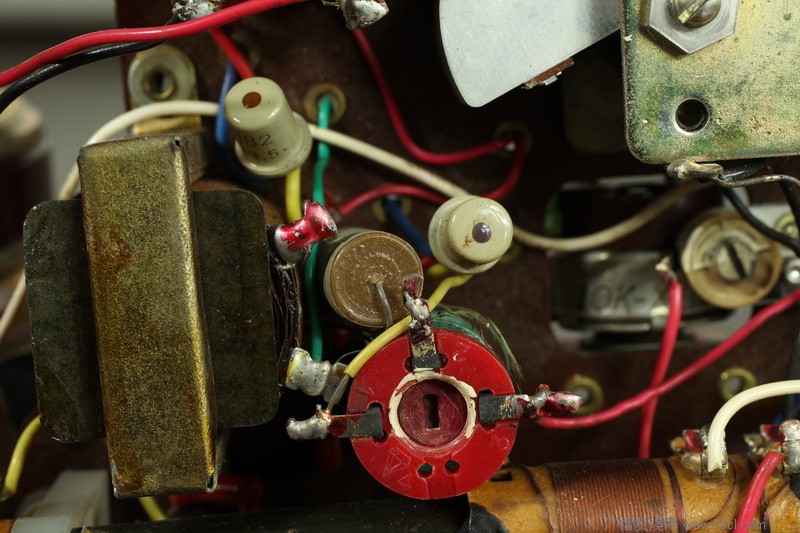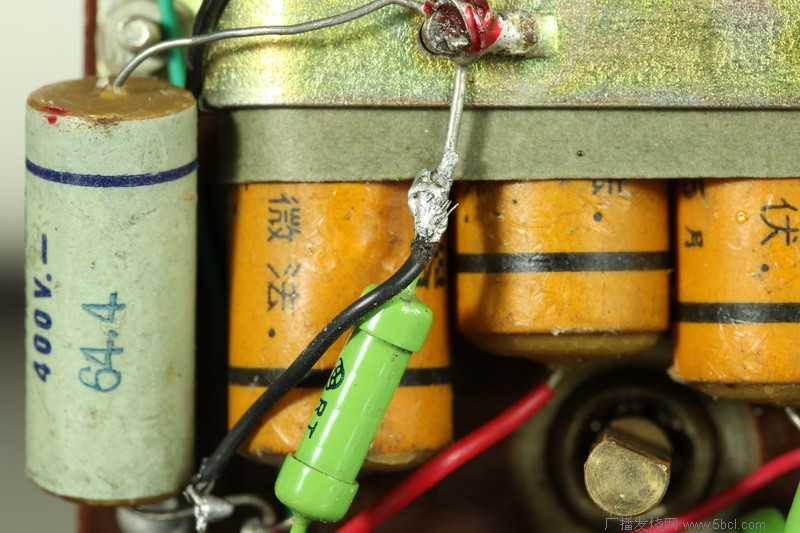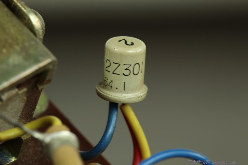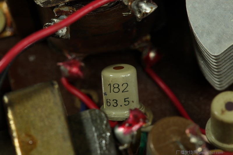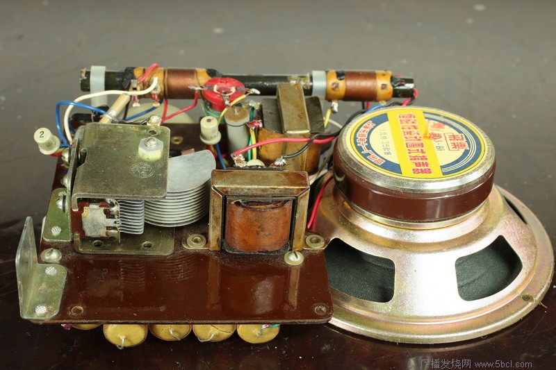 宝石牌4B2型3管机,1964年上海无线电四厂出品。此机是《无线电》60年代的“封底”明星之一,颇具传奇色彩。4B2集中了当前老机收藏者所追求的几乎所有亮点:带提梁的弧形机壳,直拨式大度盘旋纽;大纸介电解、固定电容,绿袍电阻,5寸1瓦特3.5欧姆喇叭,大空气单连,大型开关电位器,一水的电子管机装备。再补充一点,三极管是2Z301和2Z182,典型的海派风格,档次似高出П4、П6系列一头。工艺上,搭棚焊与铆钉焊相结合,秉承了电子管机的优良传统。