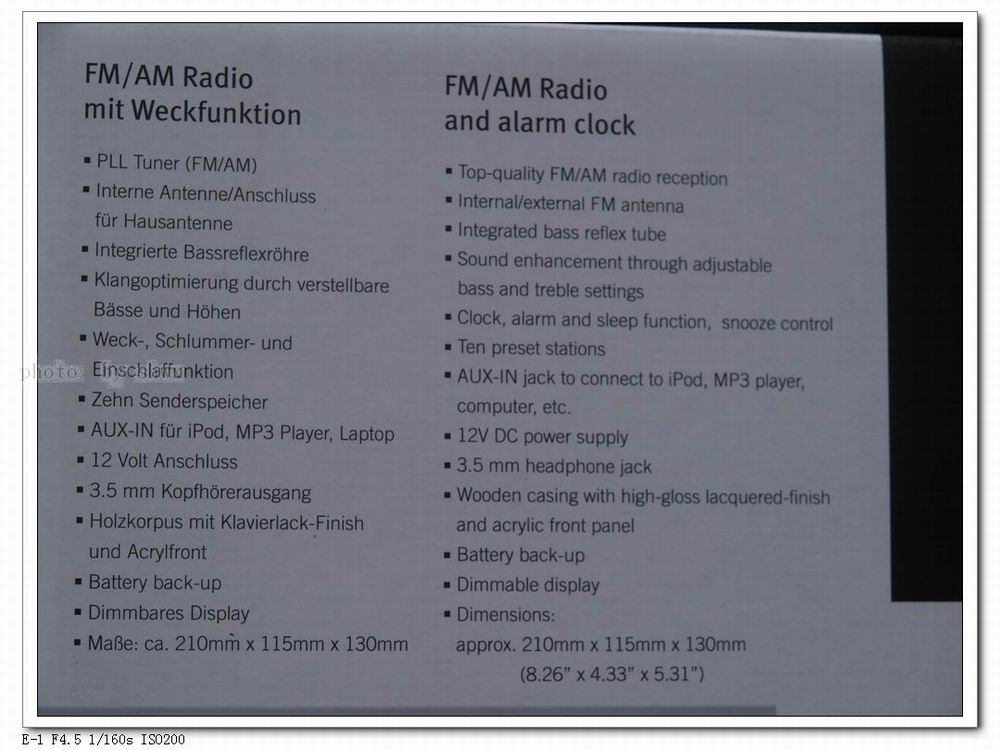 这款钟控收音机高档,音质华美耐听,虽然只有一个喇叭,但堂音丰富,仿佛单喇叭环绕声。中波接受很强。