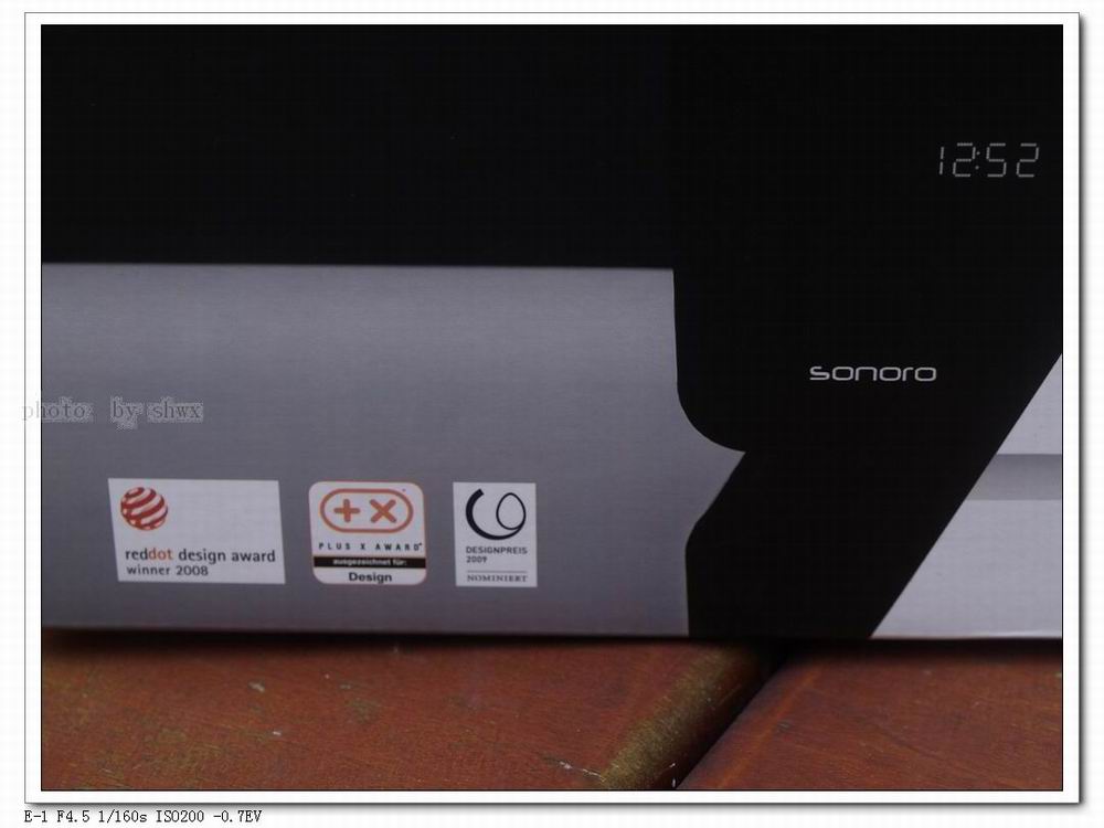 Sonoro音箱獲得了红点奖,最佳产品设计。采用内部木材设计,整体设计,显示面抛光打磨做的非常棒,除了时间显示与光环和LOGO,其他一切都是空 。音频效果因为木质材质,变得非常优异。辅助音频线设置了AM/FM插孔,抛弃了以往的扭动式调频,采用灵活的触摸光环,并且可以记录10个频道。添加了闹钟基本的多闹铃式睡眠系统。