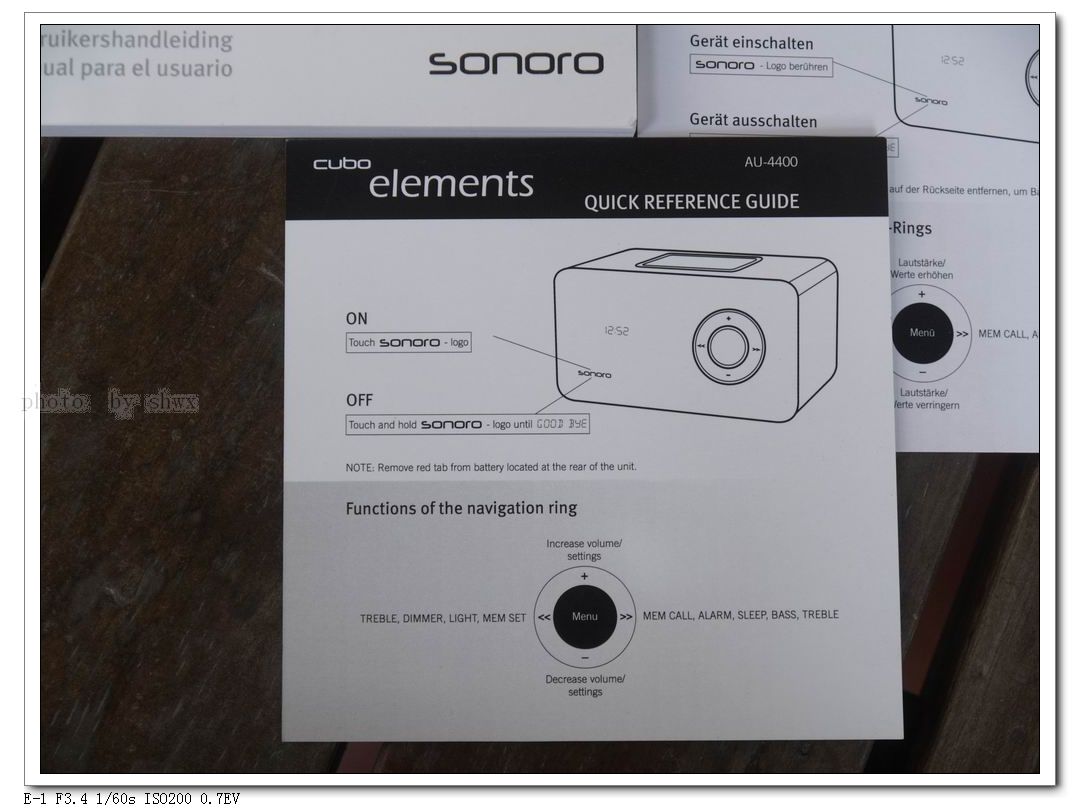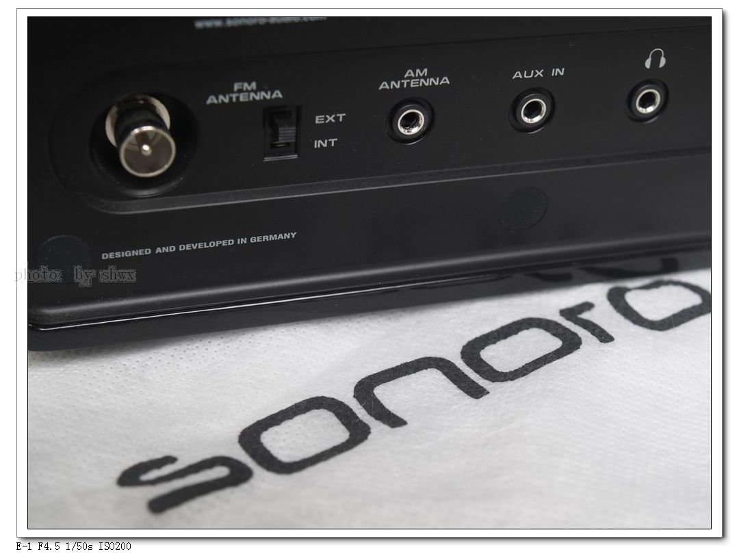 简洁的操作来自强大的工业设计和科技含量,开机、关机、选择AM/FM/AUX IN,全部在面板左下角的“Sonoro”标志上触碰控制。