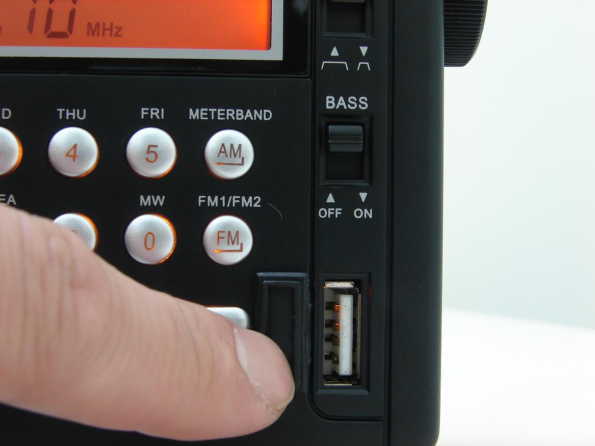 此机最大的卖点,USB闪存盘插口,原来是音量调节盘,上面有橡胶覆盖防止进灰,上面是低音开关。