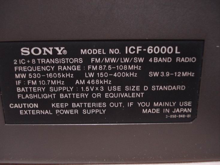 SONY/索尼 ICF-6000L FM/MW/LW/SW 4波段收音机生产年代在1976-77年左右,被认为是ICF-5900W的另类版本。属于sony的名机之一。机器给人第一感觉就是小巧玲珑,图上看上去好像很大实际并不大,侧面就一个手掌那么大高10.5厘米宽8.5厘米,只是长一点量了一下连保险杠35厘米,设计精美具有防水防摔的特点,防水:机器各个接触部分全部采用密封圈结构,你可以看图,旋钮,电池盖,耳机插孔盖四周都是密封圈,后盖和前盖之间有3毫米厚的橡胶密封圈,整个机器没有一处地方可以直通内部。防摔:面板前2点一线保险杠保护面板,2个侧面四周全是橡胶条具有保护四角的功能。机器的密封程度比我店铺的ICF-111B好上几个档次,我怀疑这款是不也是军用收音机,也可以加装一条背带在两侧的保险杠上。
