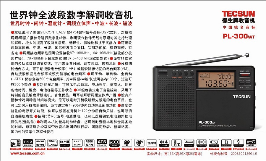 自2007年德生推出CR-220、CR-300、CR-1100型使用数字解调技术的DSP收音机后,我们与美国SILICON LABS实验室的工程师密切合作,花了大量时间,改良了DSP收音机的中短波段的接收能力,PL-300WT是德生正式投放市场的第一款DSP全波段收音机。