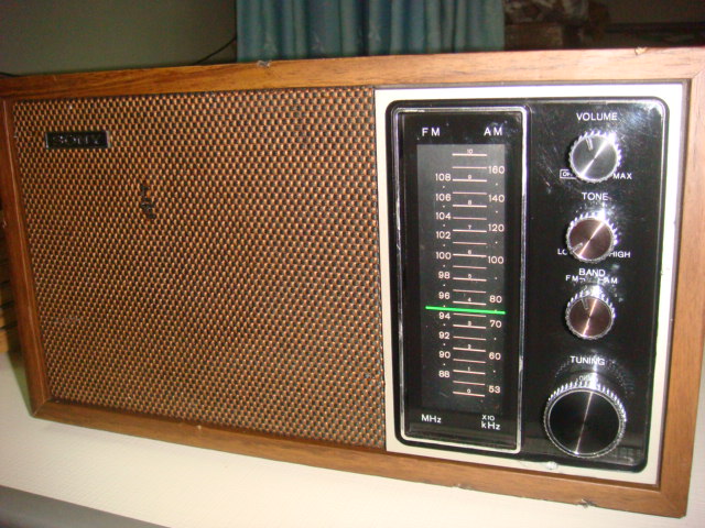 下面介绍的是这款韩国产的SONY全晶体管收音机,生产年份:1975年。11管,分立元件,2波段AM/FM,FM是87-108MHZ的,是我在广州淘街市场上买的,该机除了镙丝被换过外,其他方面店家没有维修过。里面我看过,忘了照相,里面约8成新,是塑料薄膜可变电容(美上美牌子),2W的大喇叭,调谐柔顺,声音温暖有蓬蓬声,绝对比得上德生的1994(德生的1994是集成电路的)。底噪很低,没有台的地方很安静,SONY老式晶体管机都有这个特点。调谐盘有夜光灯照明,是常亮模式,非常漂亮,橙色光。灵敏度较高,不用接外接天线大部分强强都可清晰收到,但选择性就一般了。有一些夹缝中的电台被挤掉了。若是空气可变电容应该选择性就很好了。正好我收齐了松下和SONY各一款有代表性的复古式台式机。