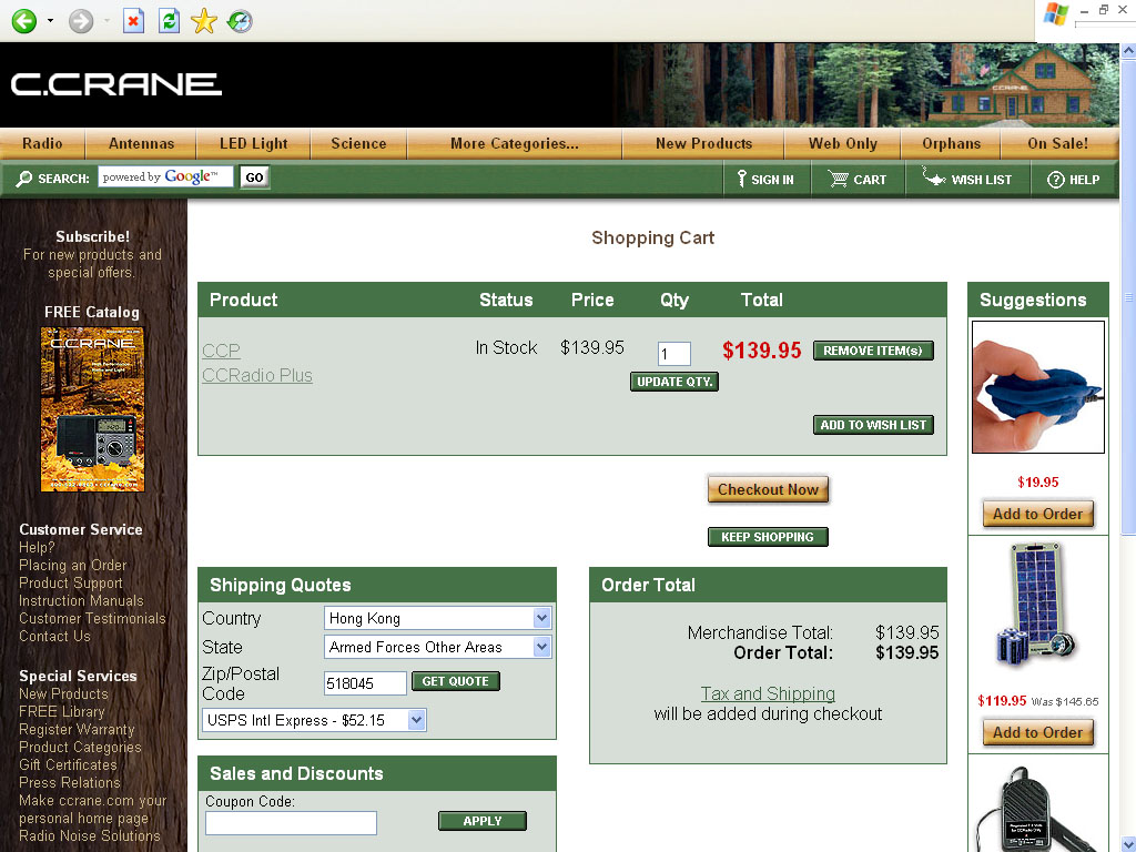 CCrane CCRadio plus在美国有售,这机是直接从美国的C. Crane公司直接邮购回来的全新机子;连运费约1400元 ($139.95 + $52.15 运费 = $192.10)。