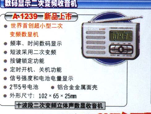 收音机 安健A-1239 广播发烧网 2006-02-18 00:00 · 1931 0 频率/时间指示打盹功能指示调频立体声指示电量指示信号强度指示睡眠定时自动关机指示定时开机功能指示中波频率单位(千赫兹)调频,短波频率单位(兆赫兹)短波波段指示中波波段指示调频波段指示 点赞 0 文章目录 × 推荐阅读50~70年代国产收音机的几款经典机型中国收音机百年史SONY 最后一台高端全波段收音机的前世今生浅谈收音机的百年发展历史固件版本为078版本的山进909X2收音机的整体表现不错国产古董级晶体管收音机——东湖牌收音机新机亮相--德劲DE1108小米LED灯下的德生PL-230德生PL-330拆机高清大图从上海滩起家的中国收音机100年史,背后是集成电路的发展史 上一篇 凯隆KK-9906S校园广播FM立体声十波段收音机分解 下一篇 给初学者的知识