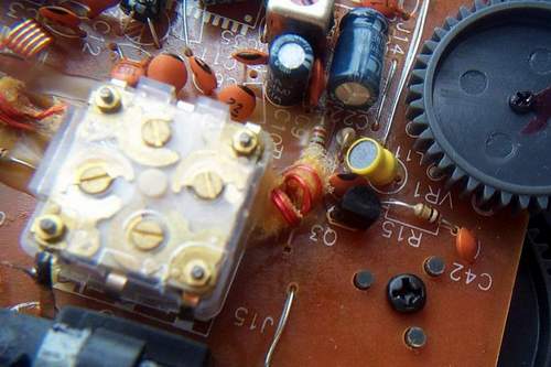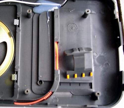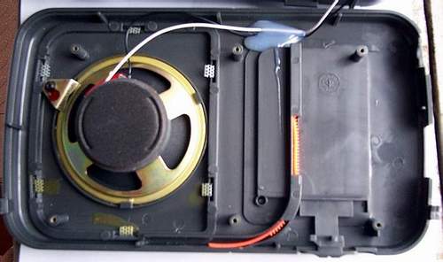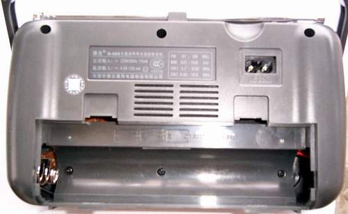 拆开R-404需要拧下6枚螺丝,从上边[电池仓]的那幅图可以看到。拧下了螺丝,很容易地就打开了面板,这时,可以看到,R-404的机壳由底盒与面板组成,面板薄小,安装有喇叭、指针齿条及波段开关的塑料滑块;底盒深厚,安装有收音机的线路板、电源变压器等。