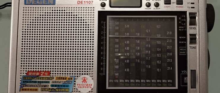 电源开关和灯光开关都是拨动式,松松垮垮,不太牢靠的样子。DE1104的扳动开关就结实,短波也多一个波段。这台1107的指针歪得厉害,而伊拉克成色的反而水平。德劲迷之做工,呵呵。1107的背光不如9700dx均匀,聊胜于无。钟控调节比较方便,无需说明书就能上手。整体来说指针式机器的操作都要比数显和数调机简单。