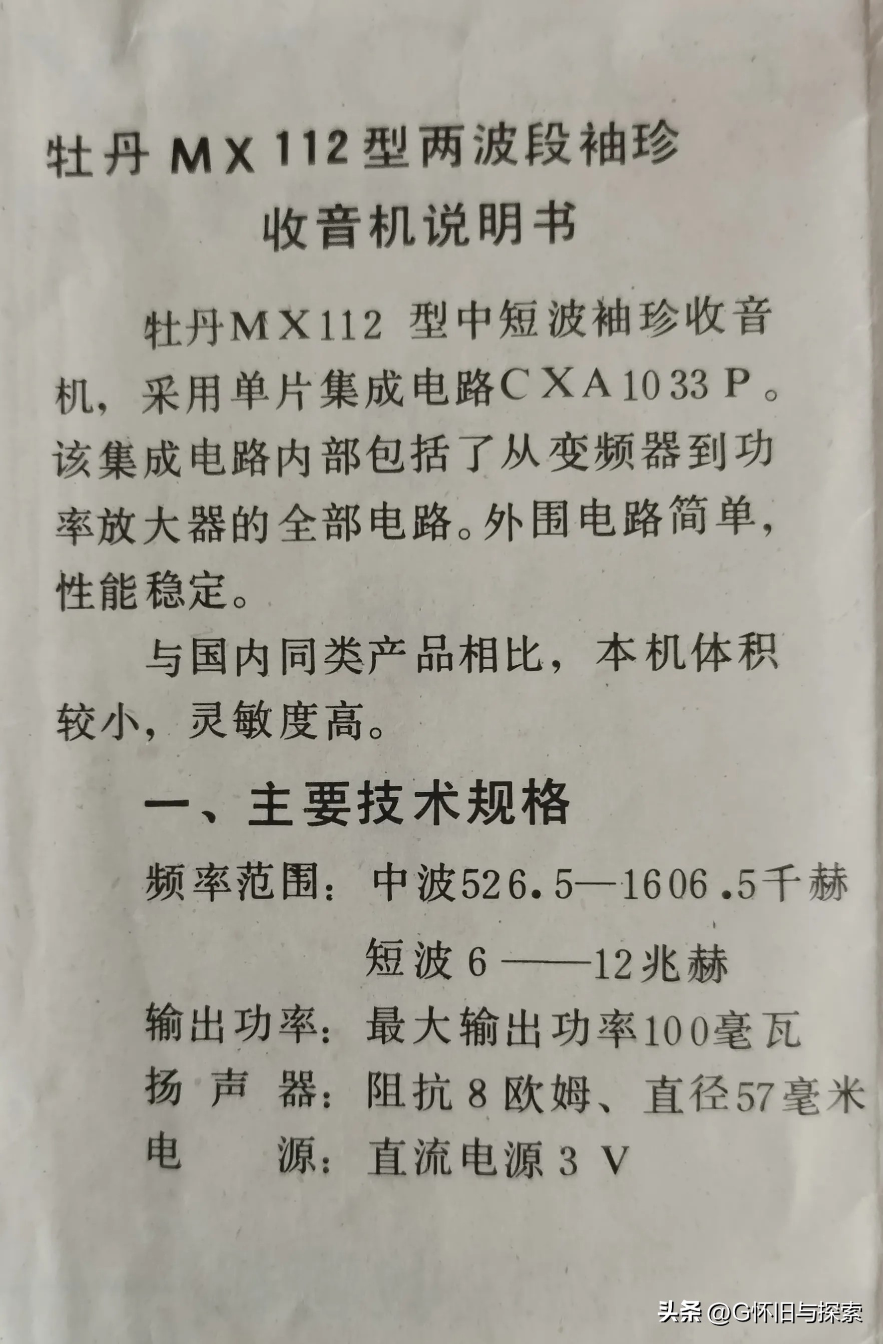 这是由当年“北京无线电厂”生产出品的“牡丹”牌,MX112型两波段、即中短波袖珍式半导体收音机。