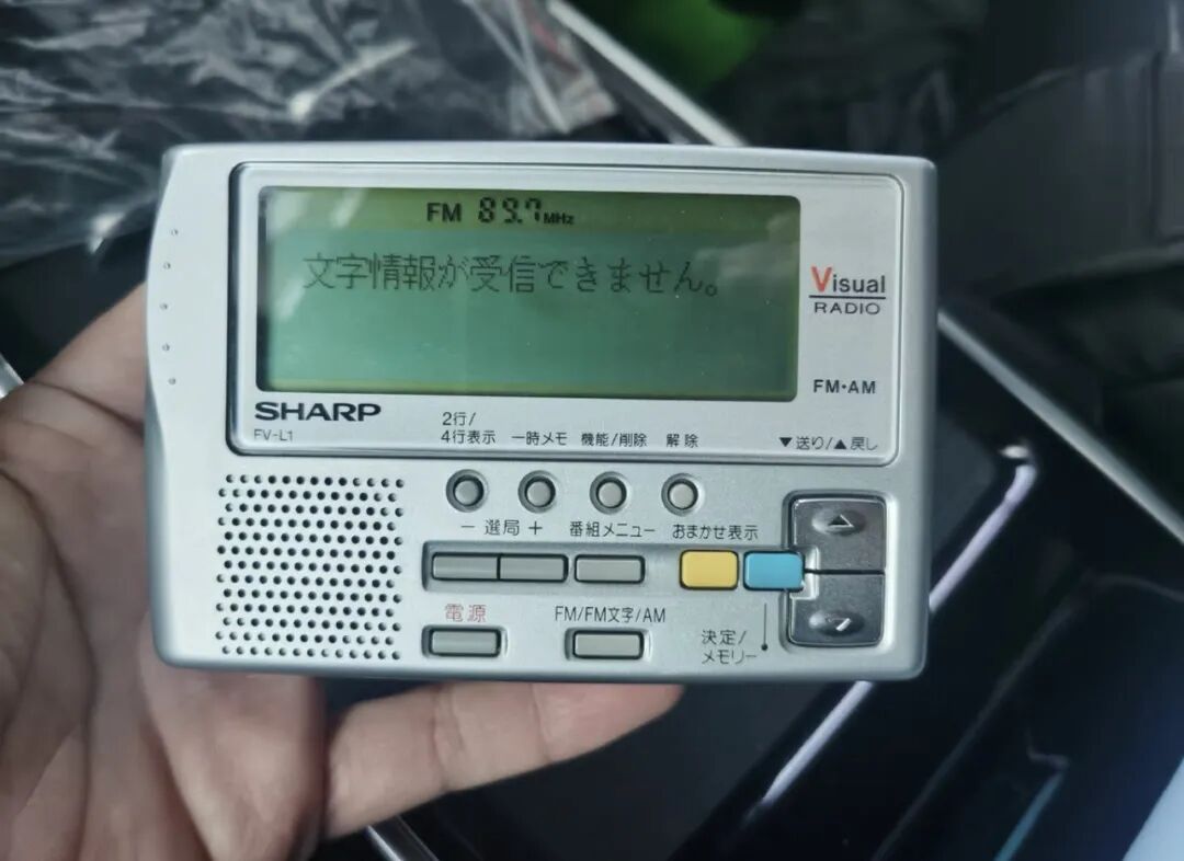带回家擦干净灰尘,装上两节五号电池,我随手按了下电源键。瞬间,绿色的背光LCD屏亮了起来,屏幕上显示着FM 89.7MHz,紧接着蹦出一行日文:“文字情報が受信できません”。我当时愣了一下,凑近了仔细看,才发现机身正面标着“Visual RADIO”,还有FM·AM的标识。这哪里是普通收音机啊,它居然能接收文字广播!在那个连智能手机都没普及的年代,能一边听声音、一边看文字信息的设备,简直是超前到离谱的黑科技。