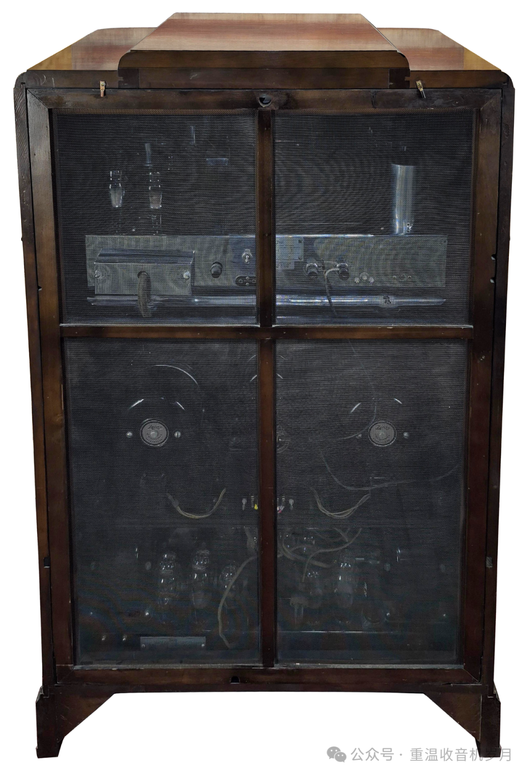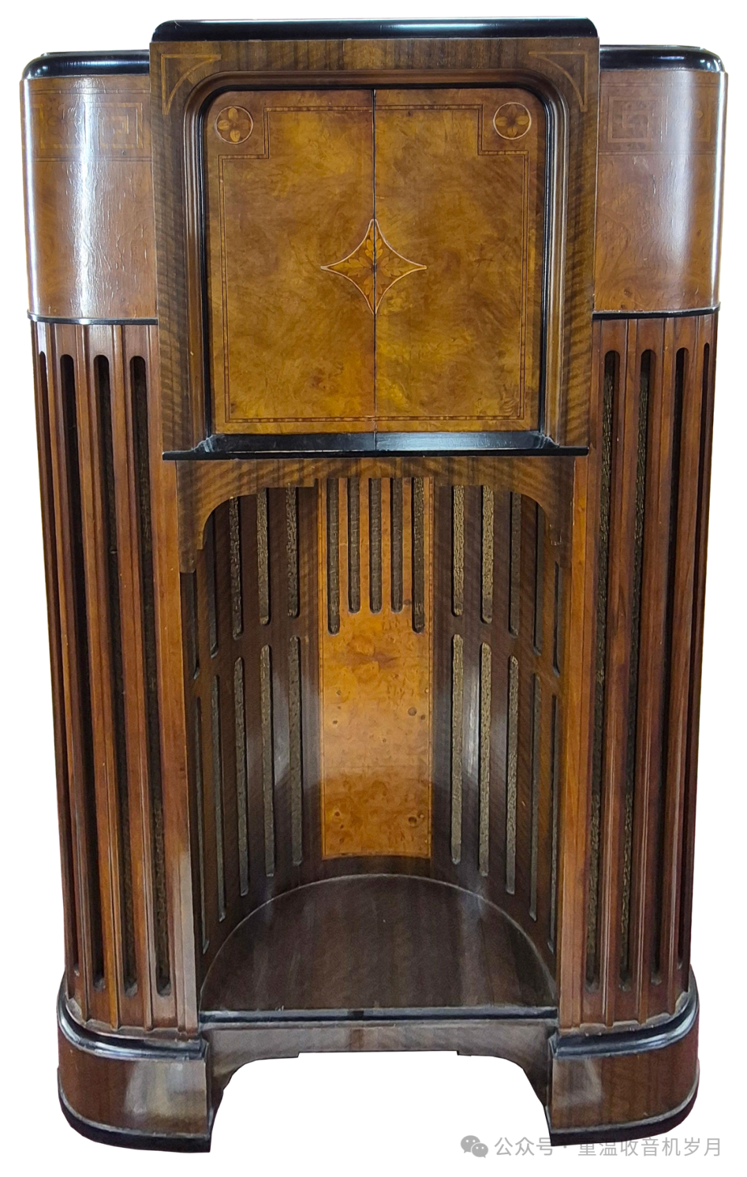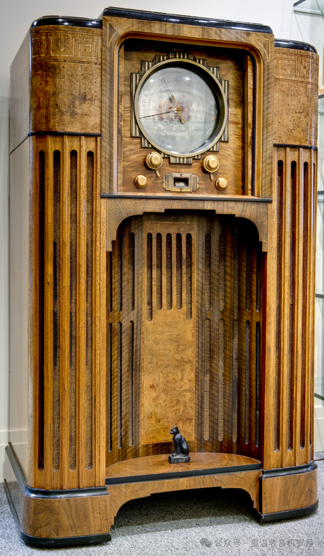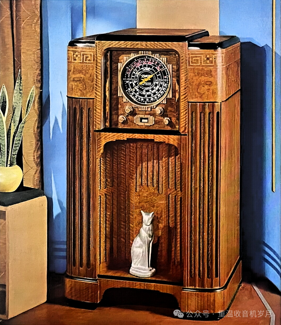 Stratosphere 1000Z型收音机代表了感性美学与理性技术的完美平衡。高达1.27米的装饰艺术风格摩天大楼式机箱由伊利诺伊州罗克福德市的著名家具设计师Frank Issac Johnson设计并申请了外观专利,使用珍稀的核桃木与澳大利亚月桂木拼花,工艺精美绝伦,设计完全遵循声学基本原理,如同小提琴一般气质非凡。整机重约325磅(约147.4千克),采用分体式镀铬底盘设计,上半部分是收音调谐器和控制电路,下半部分是巨大的供电电源和功率放大器。25个真空管的奢华配置惊艳业界,其中功放搭载8个推挽式真空管输出50瓦的强劲功率,驱动两个巨大的12英寸低音扬声器和一个6英寸高音号角扬声器,加上精妙繁复的电路设计,让它能呈现出同时代其他收音机都无法企及的堪比影院音响系统的低频响应效果,助其率先抢占了高保真市场。该机型的频率接收范围宽至535千赫至63.6兆赫(第二批产品调整为45兆赫),分为5个波段,远距离接收性能优异。其最迷人之处在于那块10英寸(约合 25.4 厘米)大的黑色圆形调谐度盘,6块特制的玻璃配有复杂的背光照明,多达14个指示灯,能够清晰显示不同波段的频率,宛如夜航飞机的仪表盘,神秘而深邃,很快成为其他制造商纷纷效仿的对象。
